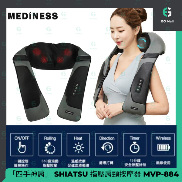 四手神肩 SHIATSU 無線頸背部指壓式溫熱模式按摩器 八按摩頭 360度循環 MVP-884