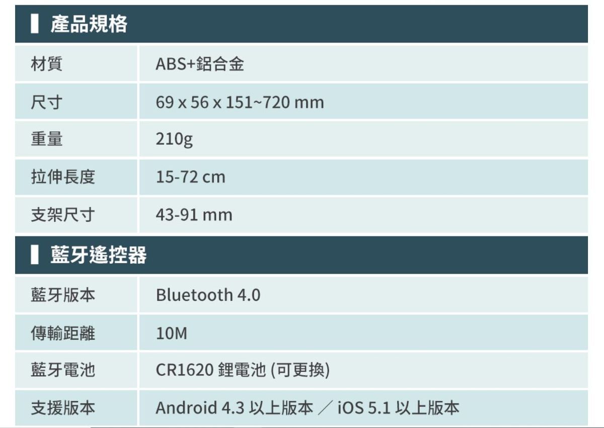 六節鋁合金桿,最長可拉伸 72 cm