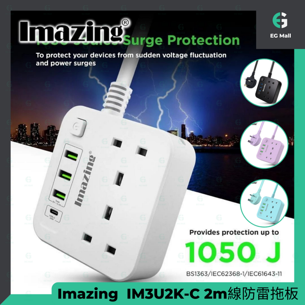 iMazing - IM3U2K-C 防雷拖板 - 2 插位3 USB Type C 30W輸出 通過香港機電工程處檢測