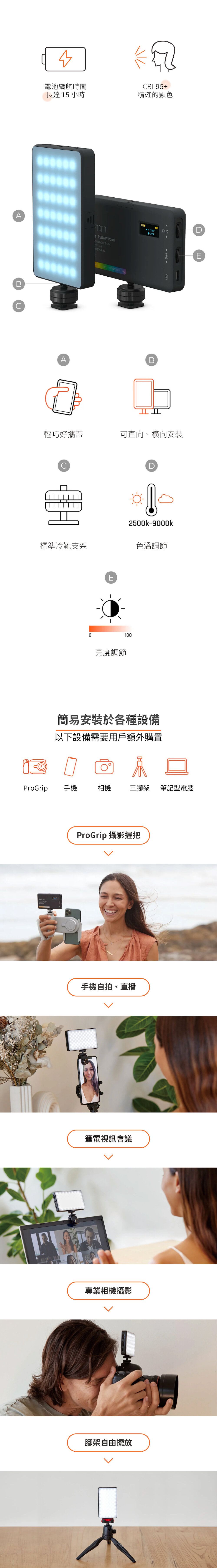 ProLED RGB 全色域補光燈 CCT 照明模式 2500-9500k 冷靴底座 Type C 充電 萬用鏡頭夾