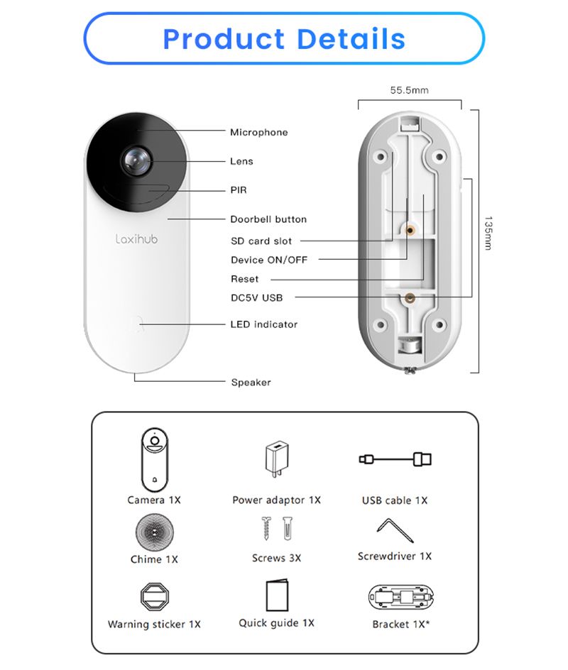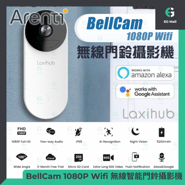 Laxihub - Arenti BellCam 1080P Wifi 無線智能門鈴攝影機 PIR 人體運動檢測 內置麥克風 揚聲器 紅外線夜視 Megapixel CMOS