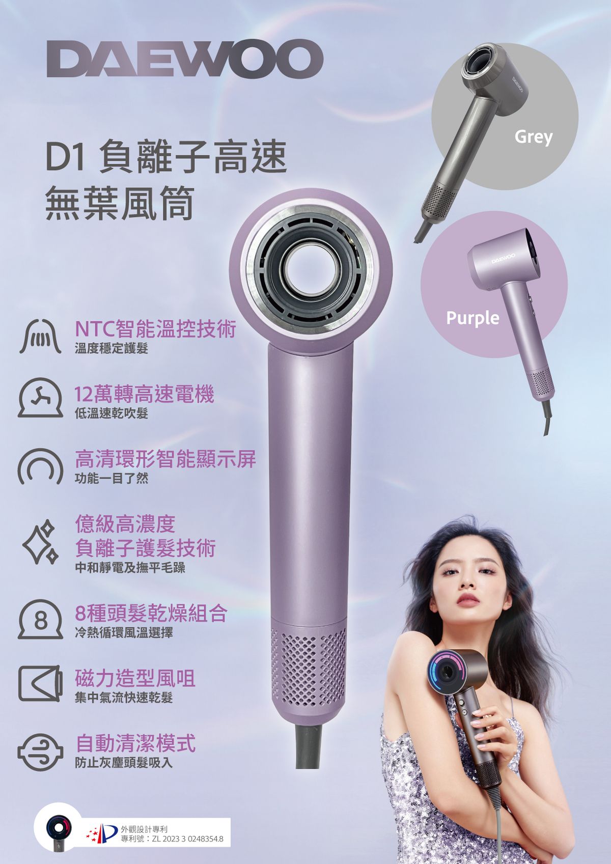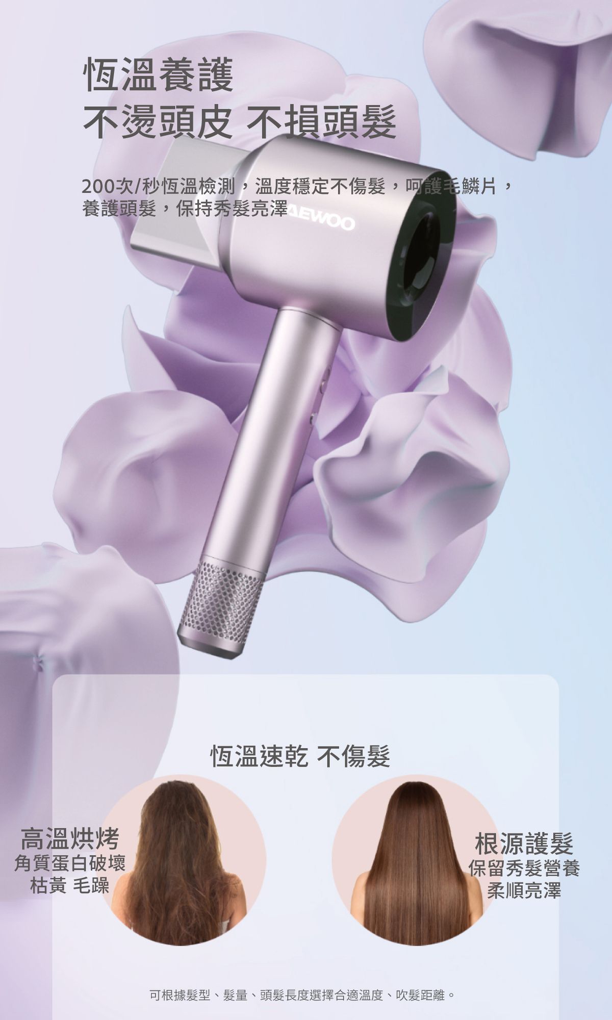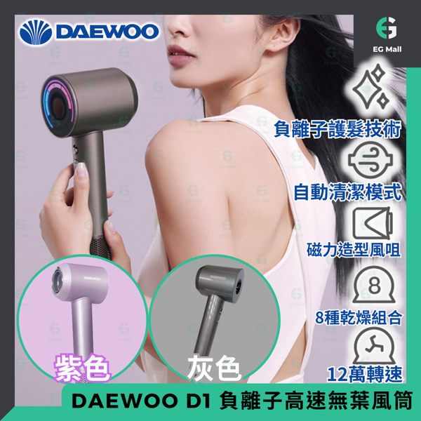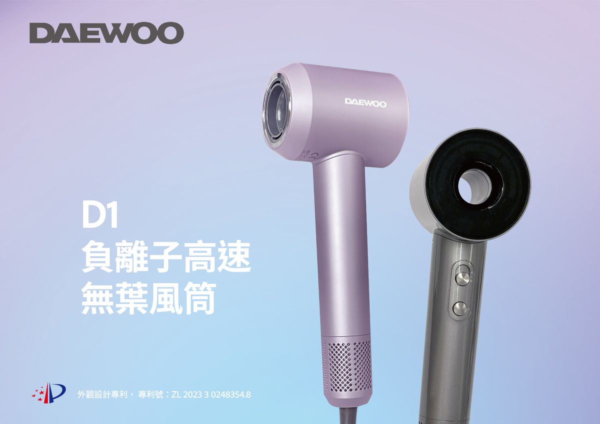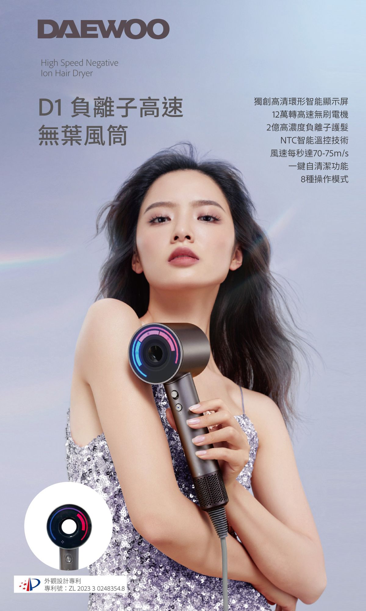 DAEWOO 大宇 D1 負離子護髮高速無葉風筒 Negative Ion High Speed Dryer 1600W 12 萬轉高速純銅電機 NTC 智能溫控 490g 快乾風筒 吹風機