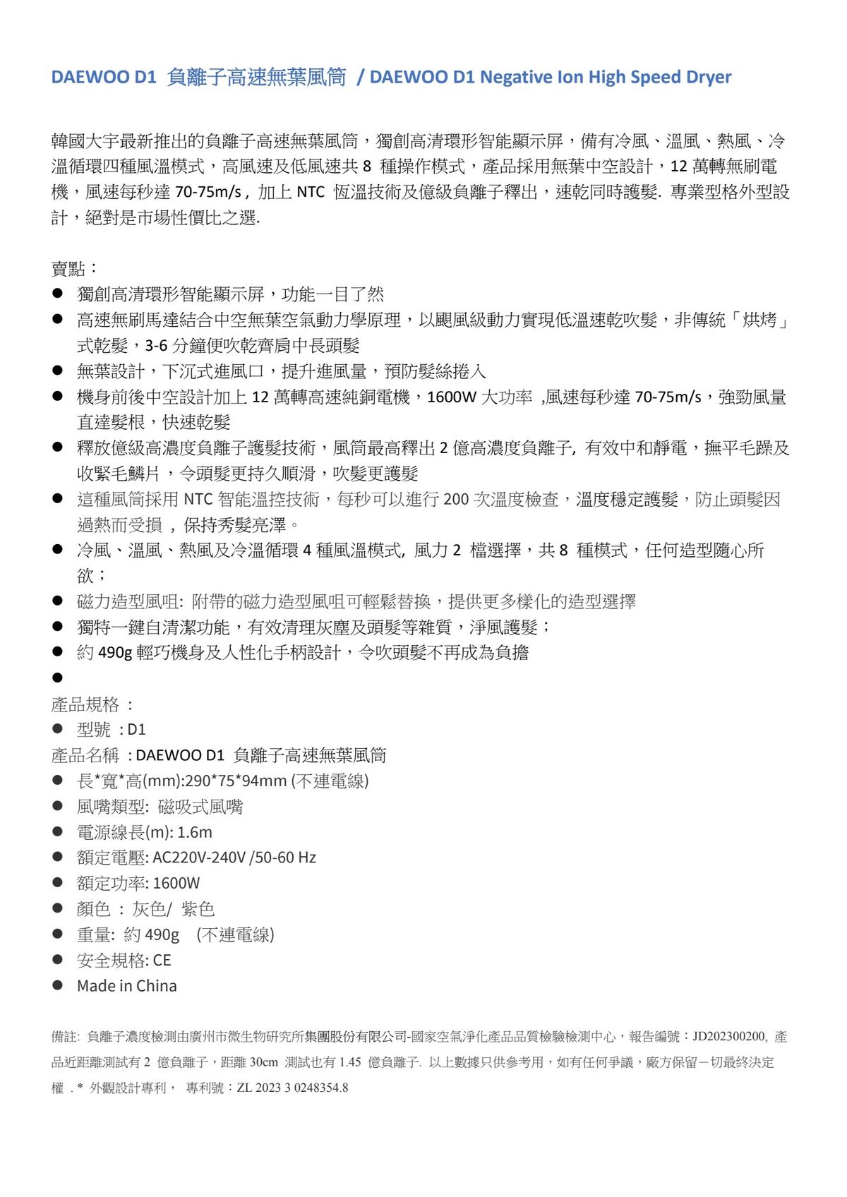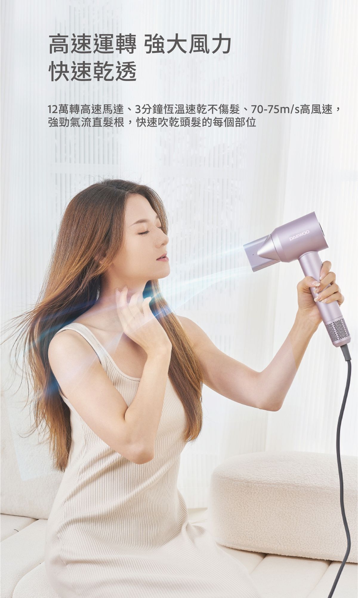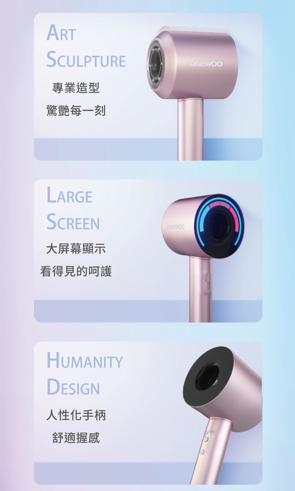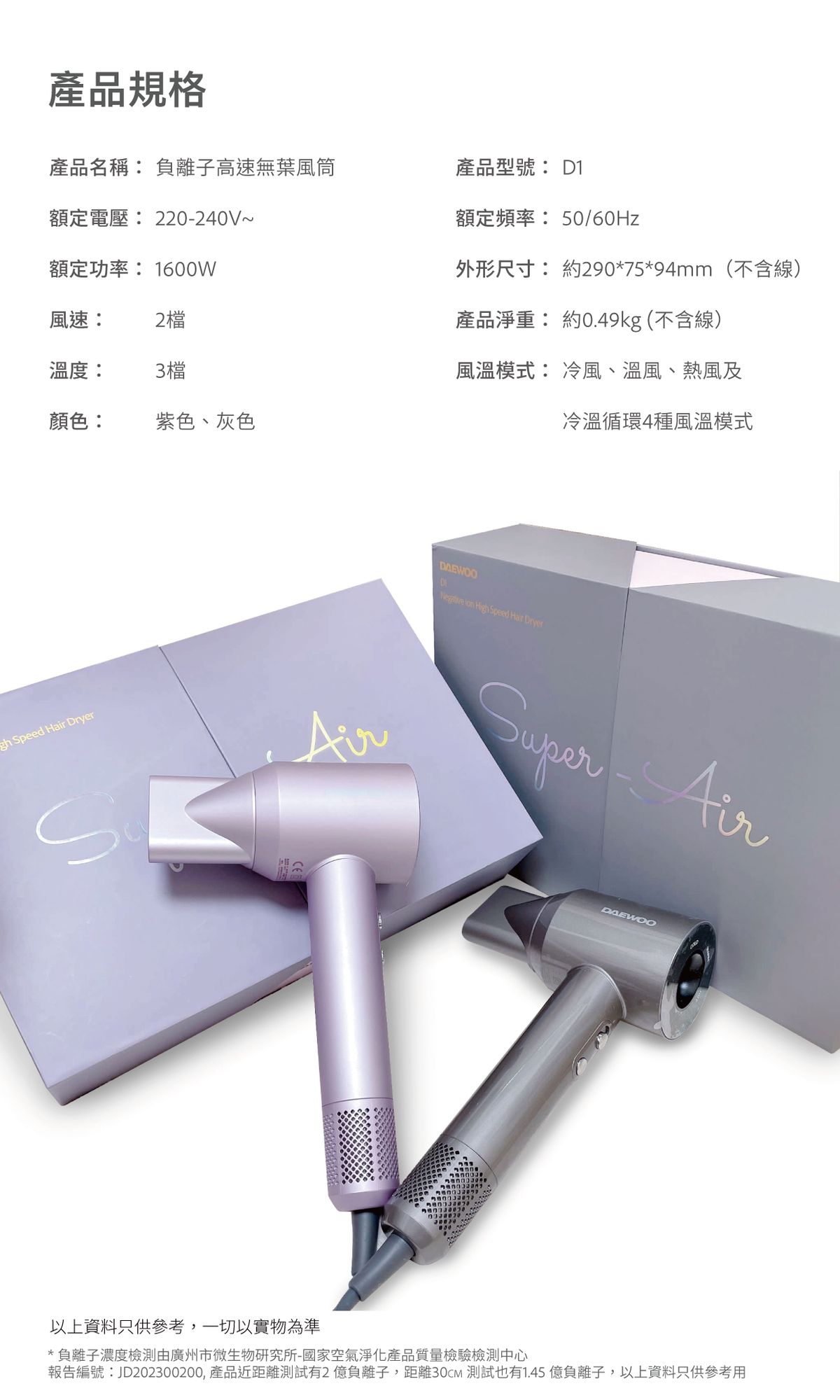 DAEWOO 大宇 D1 負離子護髮高速無葉風筒 Negative Ion High Speed Dryer 1600W 12 萬轉高速純銅電機 NTC 智能溫控 490g 快乾風筒 吹風機