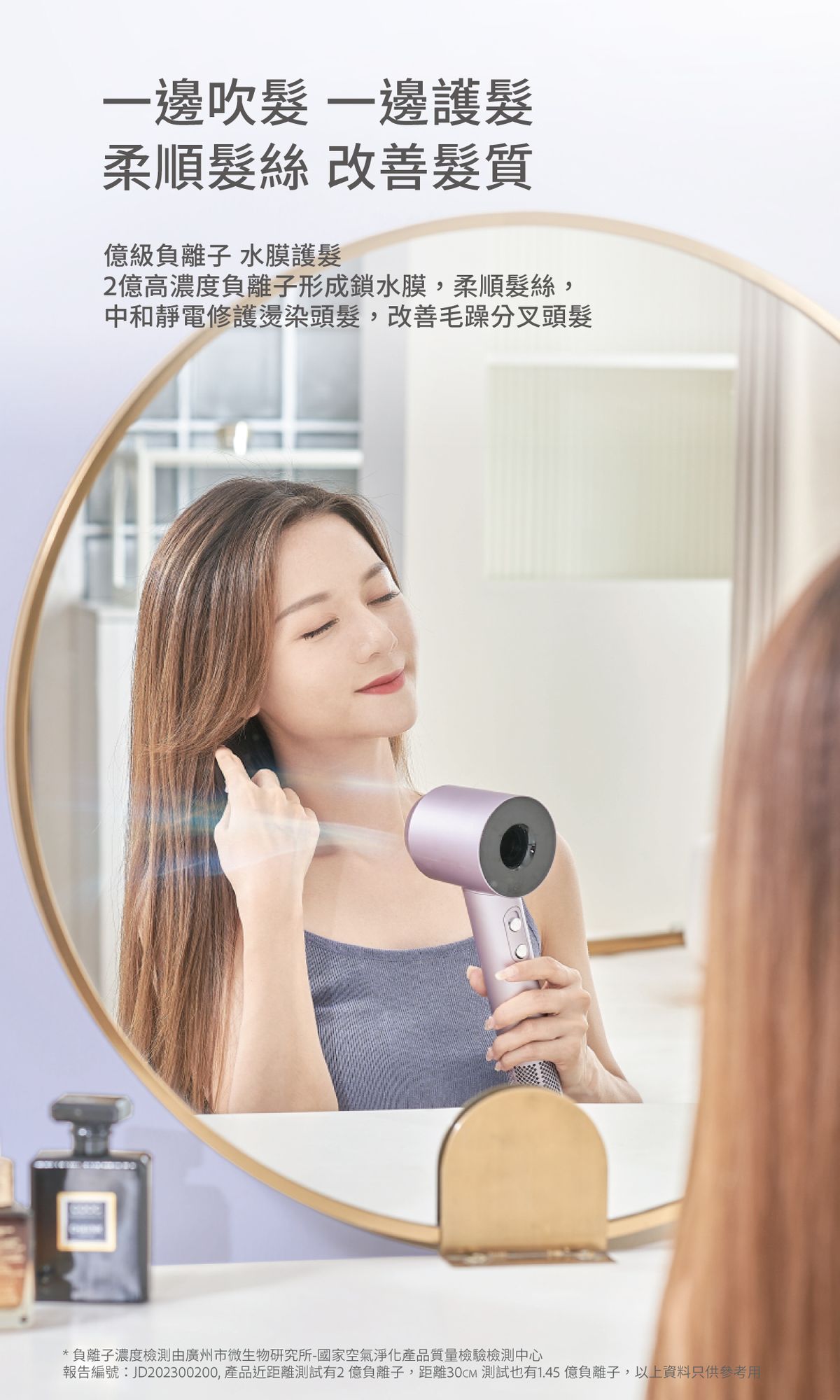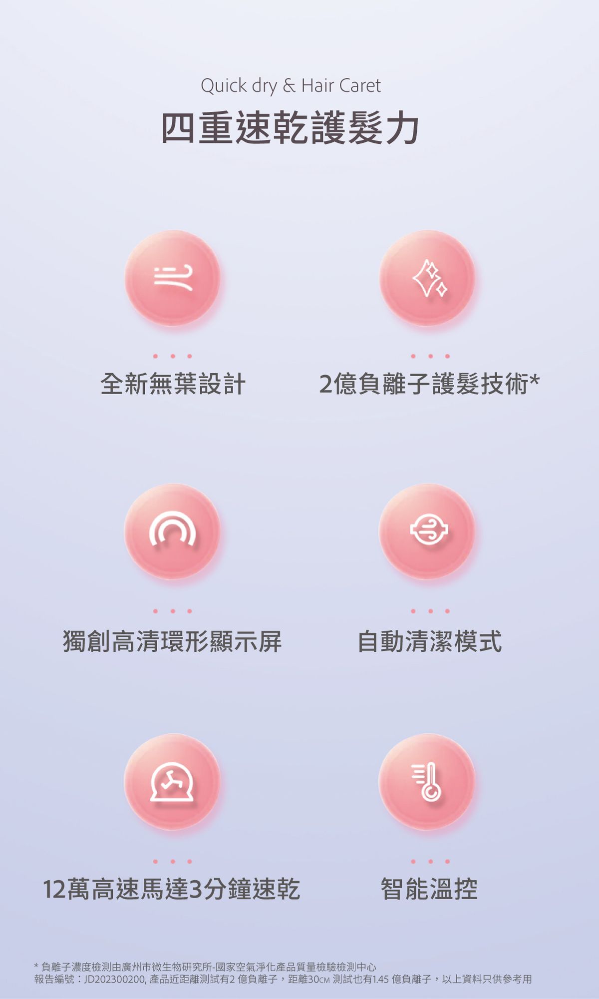 釋放億級高濃度負離子護髮技術,風筒最高釋出 2 億高濃度負離子, 有效中和靜電,撫平毛躁及