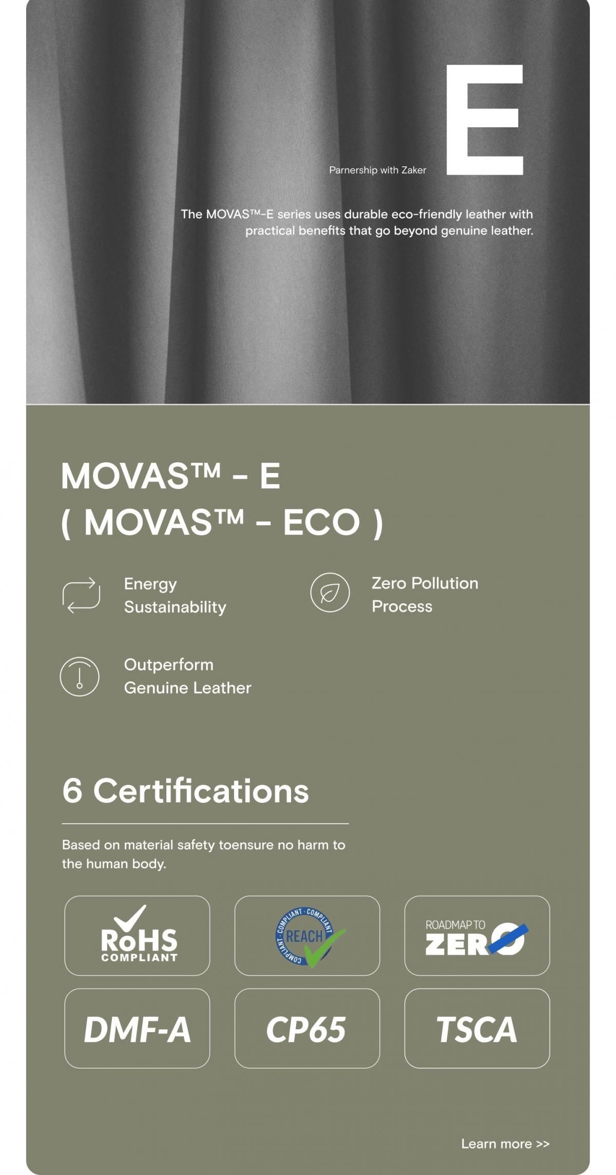 MOVAS-E 純素皮革還通過獨特的染色工藝和材料保持其鮮艷的顏色很長一段時間。補充:避免使用可能損壞皮革並導致褪色的強力化學品。為了保持其外觀,使用濃度低於75%的酒精,並在日常維護程序中避免使用其他化學清潔劑。