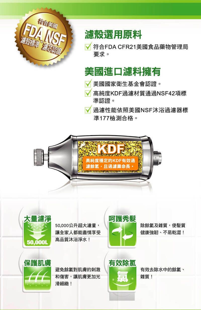 高純度KDF過濾物材質,通過NSF42標準認證。過濾性能依照美國NSF沐浴過濾器標準177檢測合格。