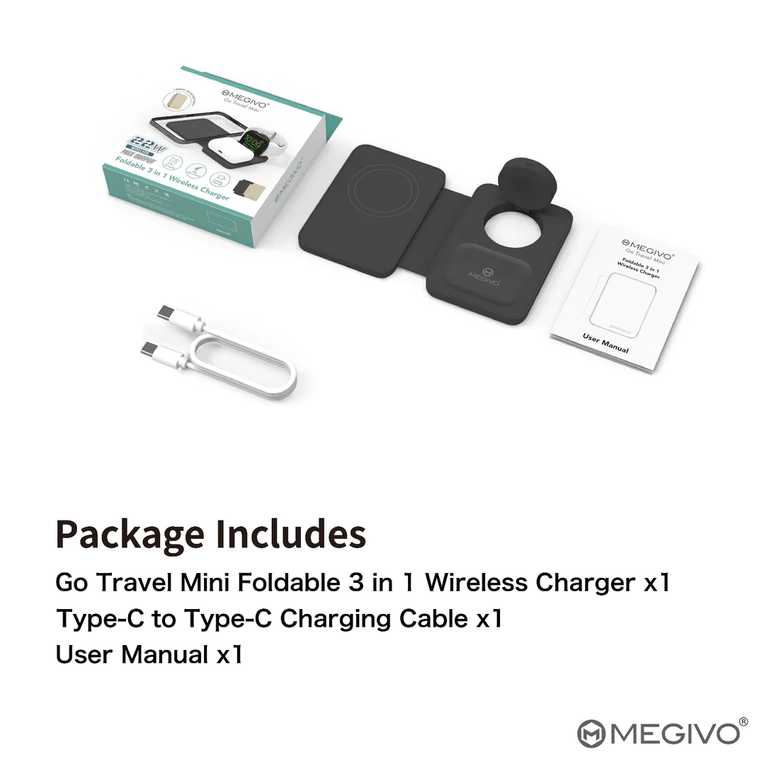 Megivo - Go Travel Mini 3合1 無線充電板 無線充電器 快充 Type-C to C 智能充電 摺疊充電器