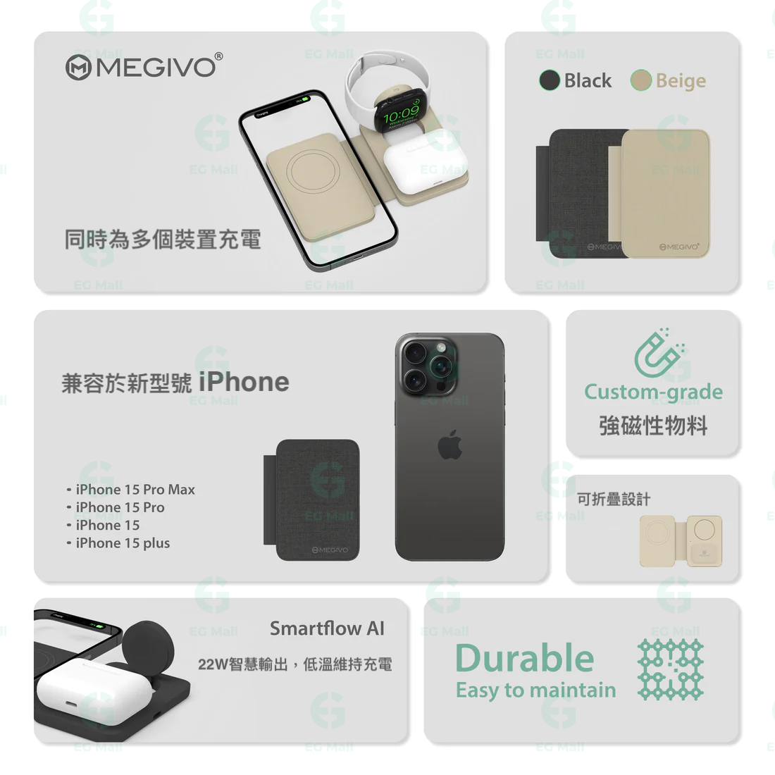 手機無線輸出最大15W / Apple Airpod Pro 耳機 3W / Apple Iwatch 手錶 2.5W