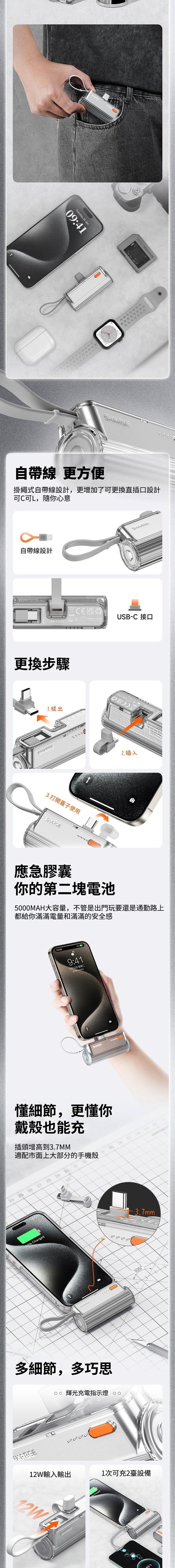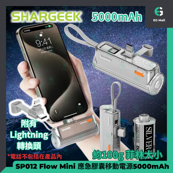 SHARGEEK - SHARGE Flow Mini SP012 TypeC IOS 應急膠囊移動電源 5000mAh 附有Lightning轉換頭 可更換直插口 自帶線 直入式超快速充電 即插即用
