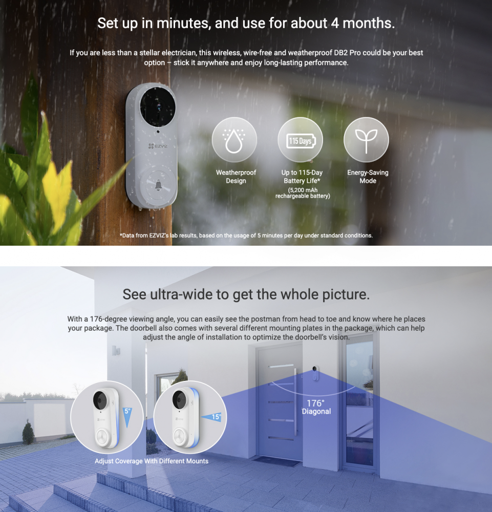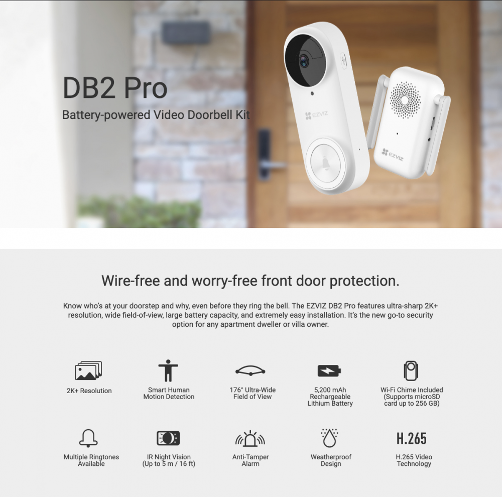 Ezviz - 螢石 DB2 DB 2 Pro 防風雨 全無線智能門鐘套装 智能門鈴 CS-DB2-A0-2C5WPBR 紅外線濾光片 日夜模式 智能人體感應 智能家居