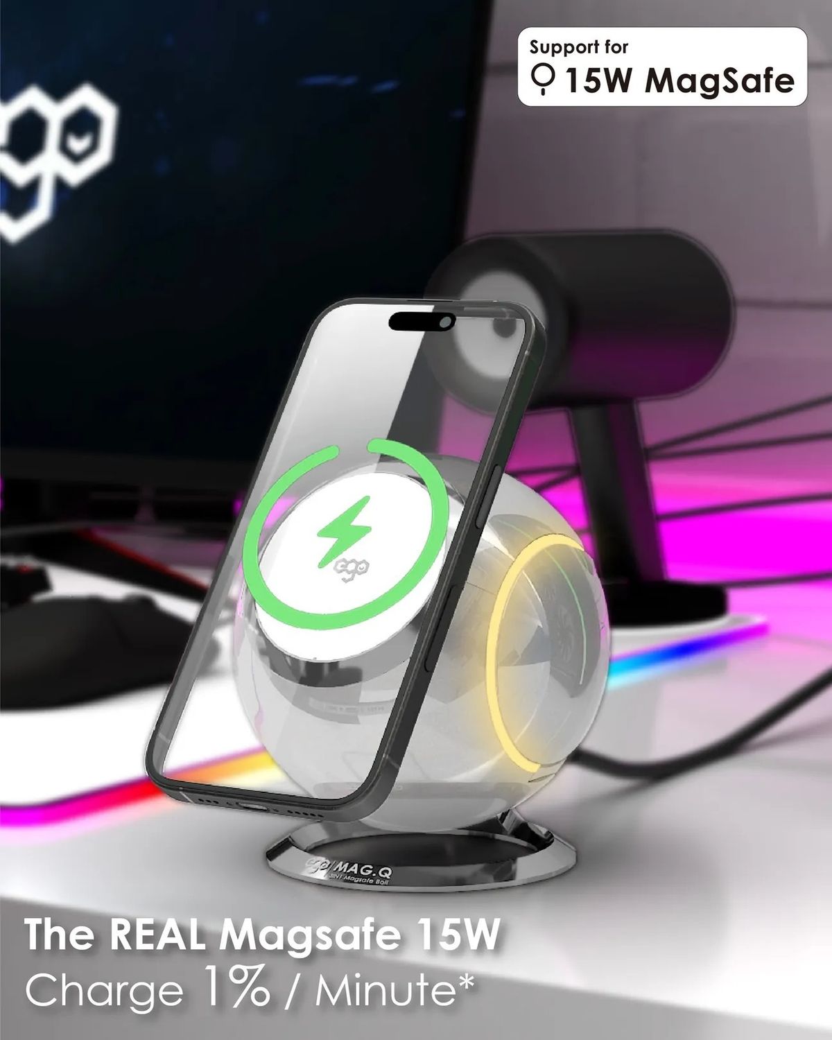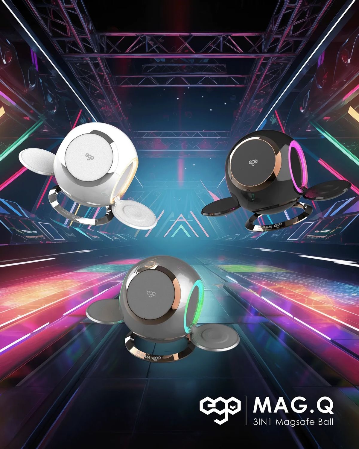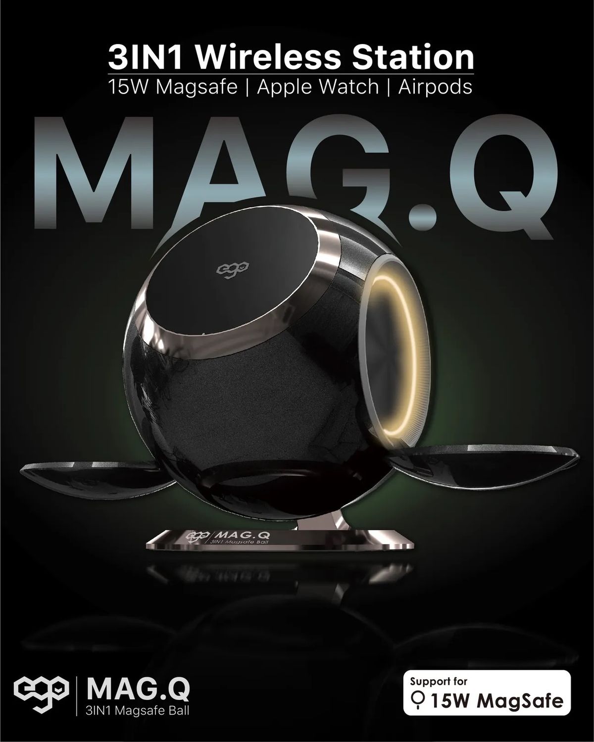 ego - EGO Mag.Q @ 3合1 Magsafe 15W QI 無線充電座 RGB 可摺疊充電座 N48 磁鐵 附送Type-C to C 電源線 1.2m