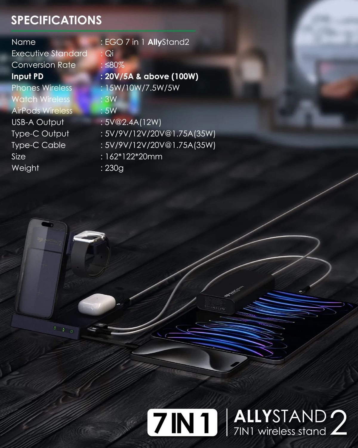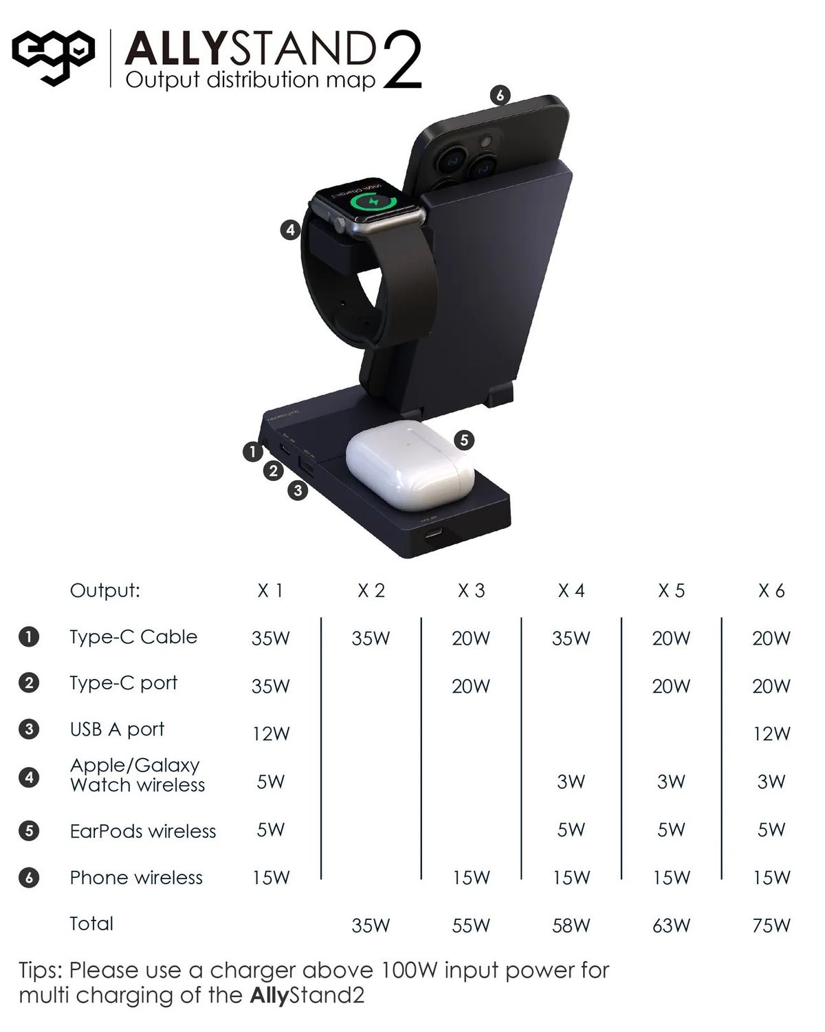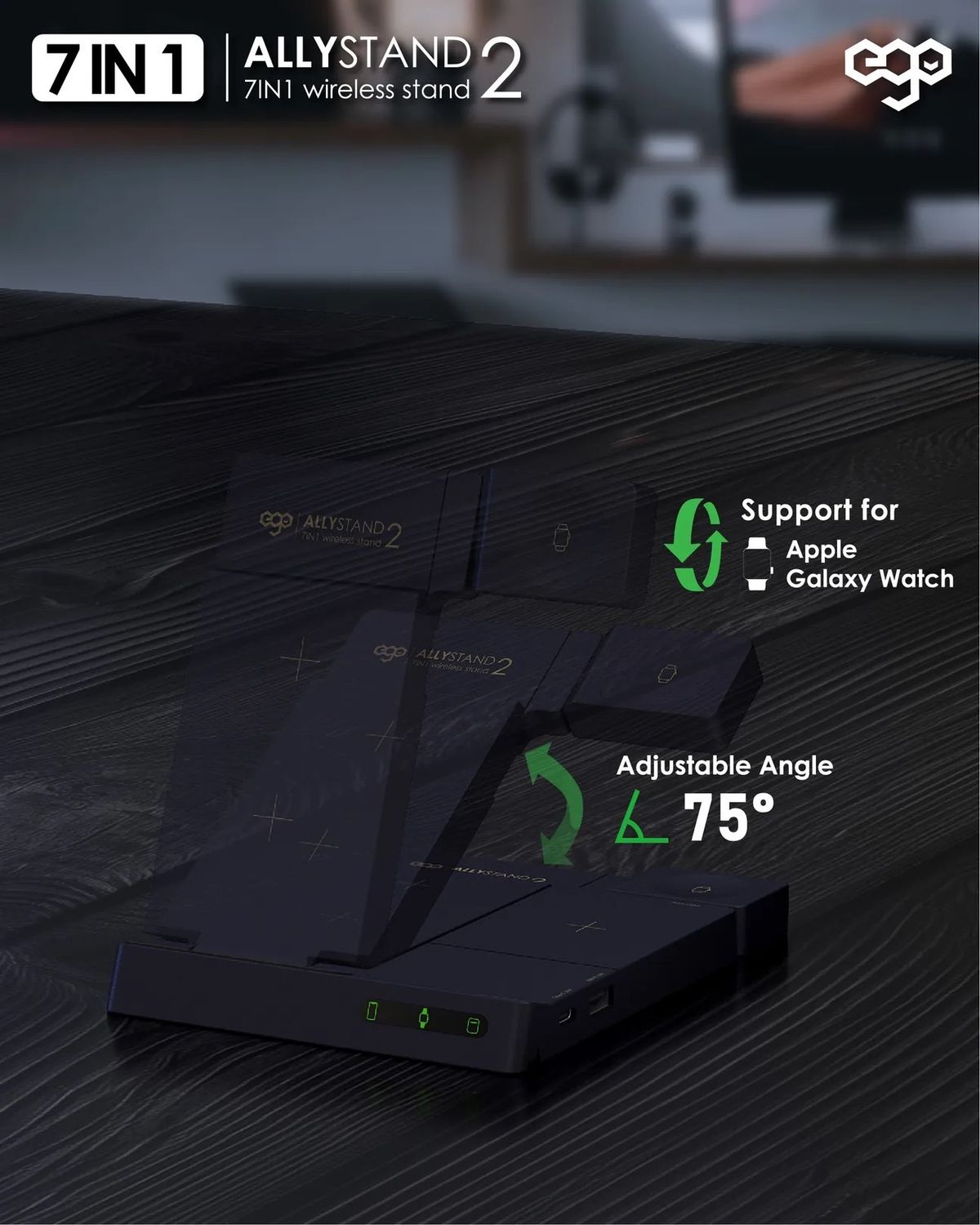 ego - AllyStand 2 7合1 75W PD QI 無線充電座 GaN 3代 三星手錶 蘋果 Iwatch 附送Type-C to C 100w 電源線 1.2m 調整角度設計