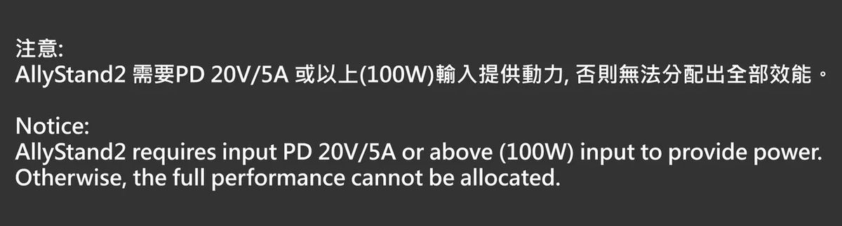 注意: AllyStand2需要PD20V/5A或以上(100W)輸入提供動力,否則無法分配出全部效能。需要 20V/5A或PD 100W 以上Type-C 充電器. 才可以發揮全部效能 (需另購)