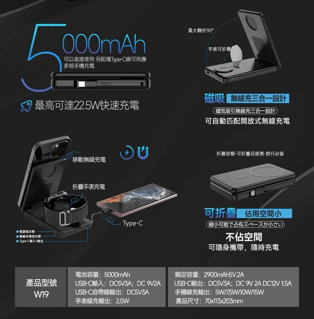 ARGO - MagSafe 對應磁吸無線充電 W19 22.5W Type C 5000mAh + 便攜折疊式充電座 多功能 無線充電座 行動充電器 行動電源 充電器 叉電器 充電寶