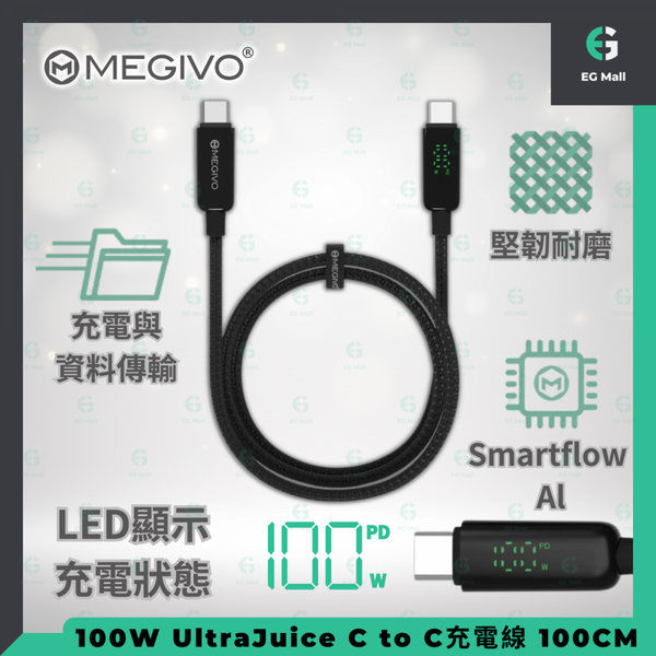 Megivo - 100W 100CM UltraJuice C to C QC PD 3.0 即時速度顯示 E-MARKER Type C to Type C 500D 編織 充電線 傳輸線