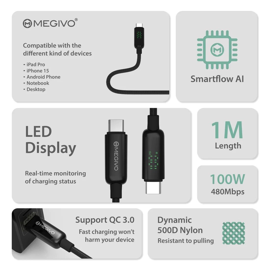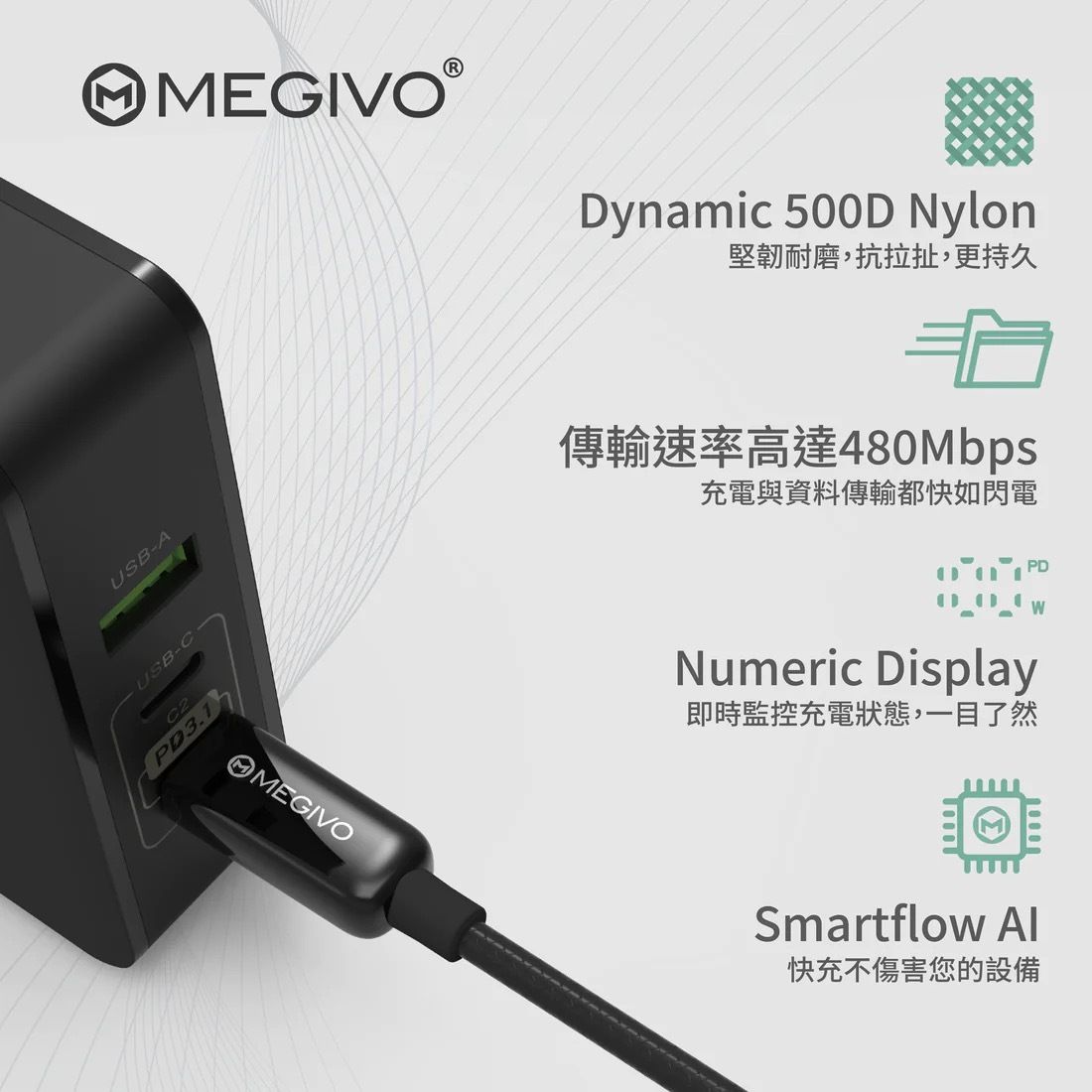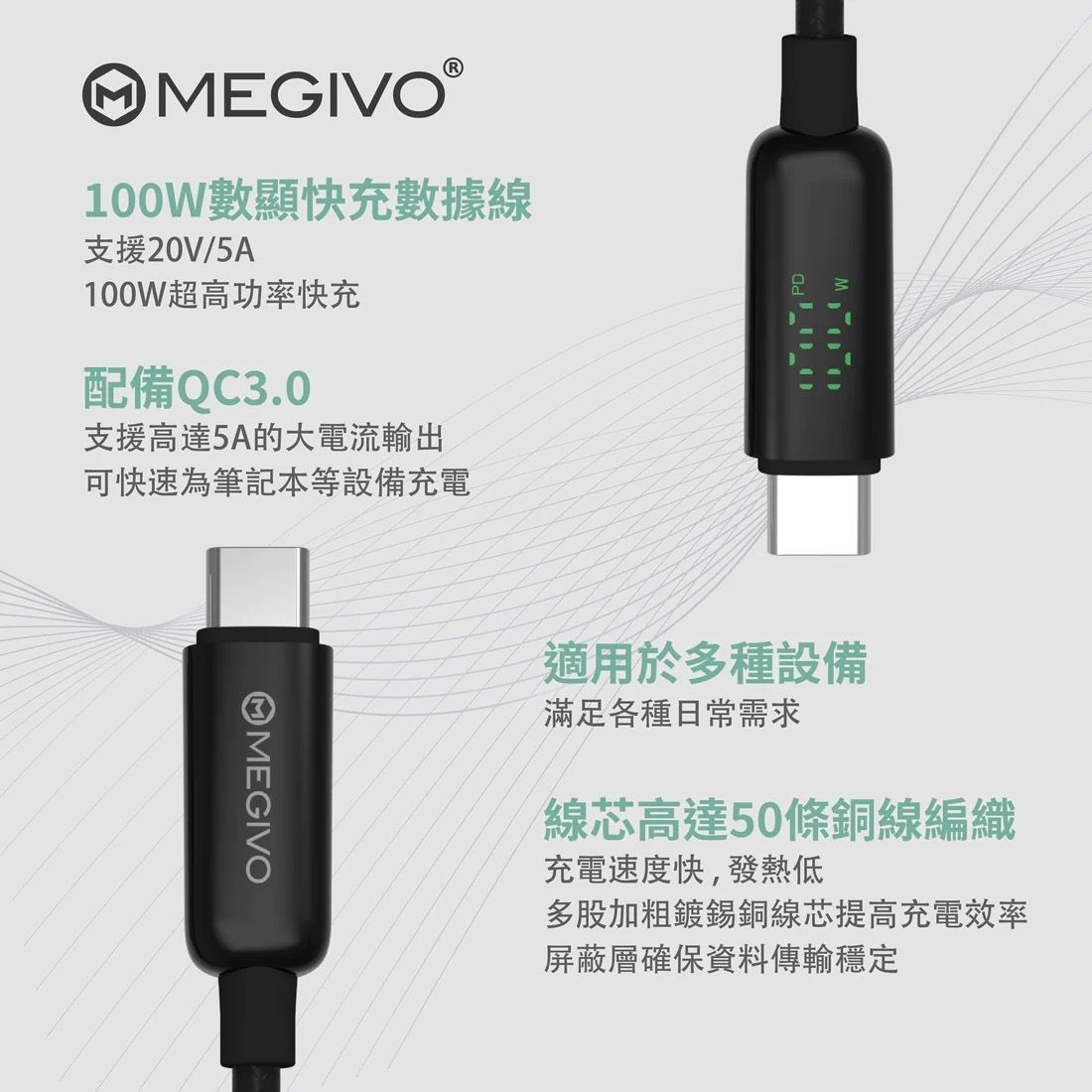 MEGIVO 第一款Type-C 100w 充電數量線使用Numeric Display 技術