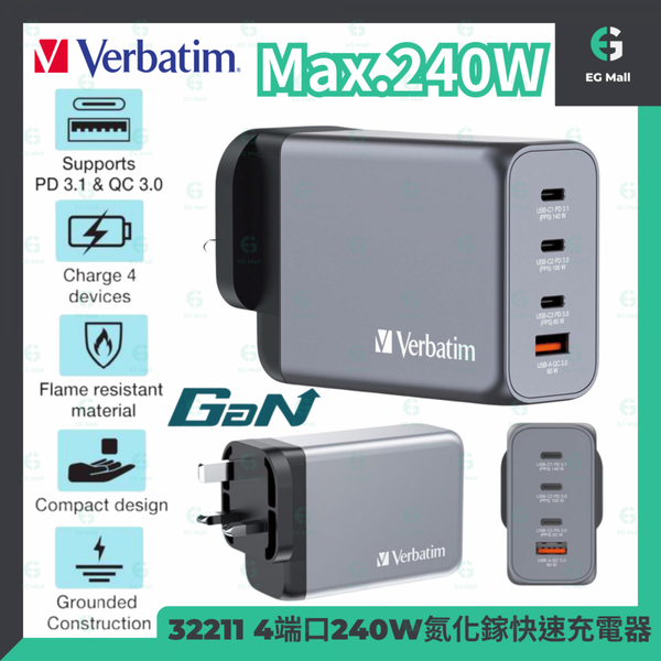Verbatim 4端口 240W PD 3.1 & QC 3.0 GaN 充電器 32211 1 USB 3 個 TYPE C 氮化鎵 快速充電器手機 平板 手提電腦 快充火牛 叉電器