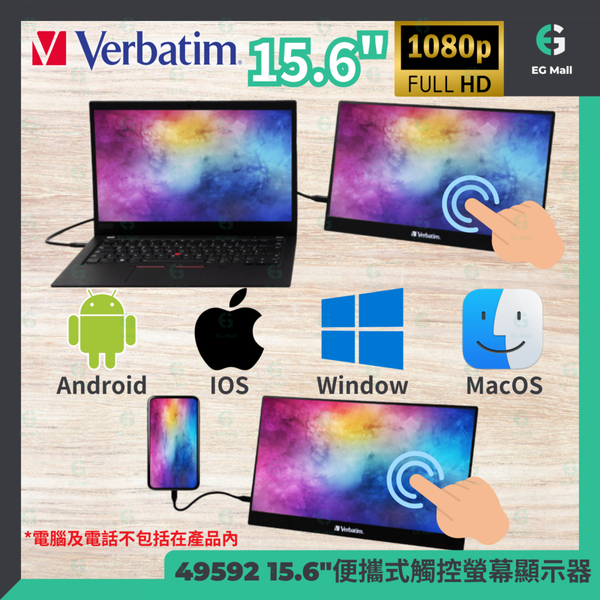 Verbatim - 便攜式觸控螢幕顯示器 15.6" 49592 FHD 1080p 即插即用 mac Windows IOS Android Switch DisplayPort Monitor