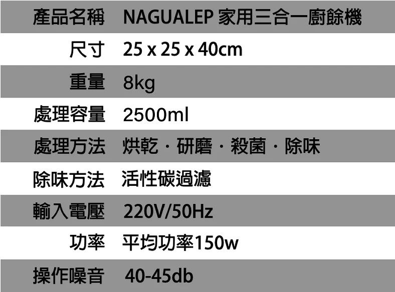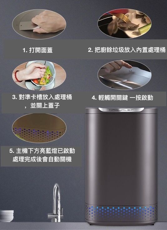 NAGUALEP推出既三合一廚餘機係一個好好選擇,呢款三合一廚餘機已經推出到第二代,可同時低噪研磨、高溫烘乾、去菌除臭。採用126度高溫烘乾研磨方式,家中常見既剩飯剩菜等堅硬廚餘都能夠化為土屑,更可用作植物肥料既原料。而且擁有有效殺滅99.9%去菌除臭功能,為環保出力之餘,衛生同樣得到改善。