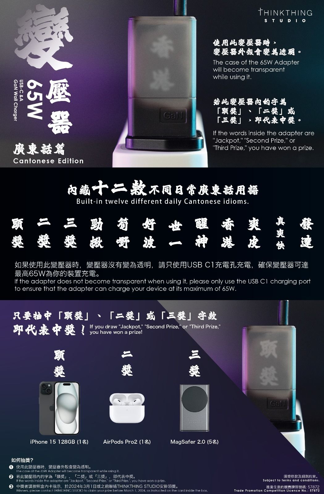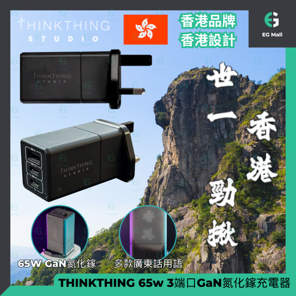THINKTHING Studio 65w Charger 3 端口 65W PD 3.0 & QC 3.0 GaN 氮化鎵 快速充電器手機 平板 手提電腦 USB TYPE C 充電器 叉電器
