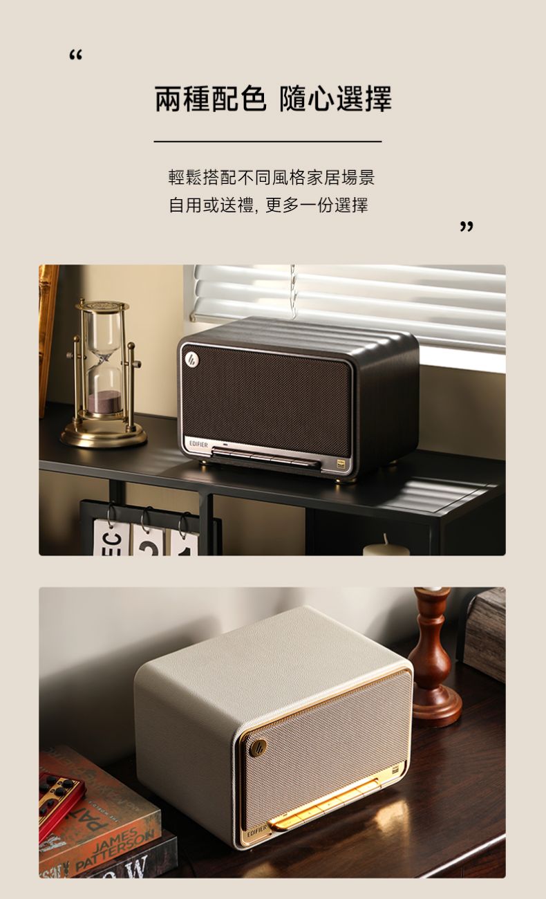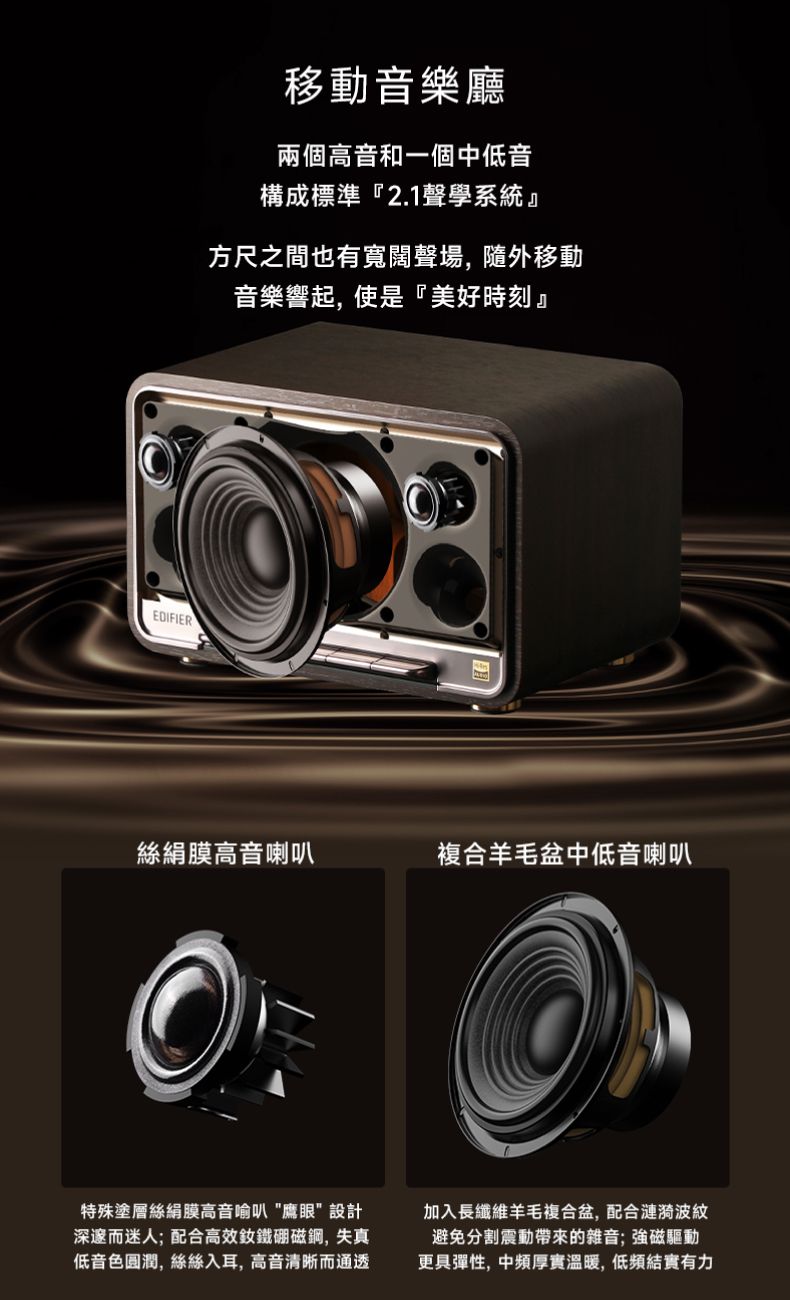 - 雙 1 吋 (25 mm) 絲絹膜高音喇叭 和 4 吋 (116 mm) 複合羊毛盆中低音喇叭