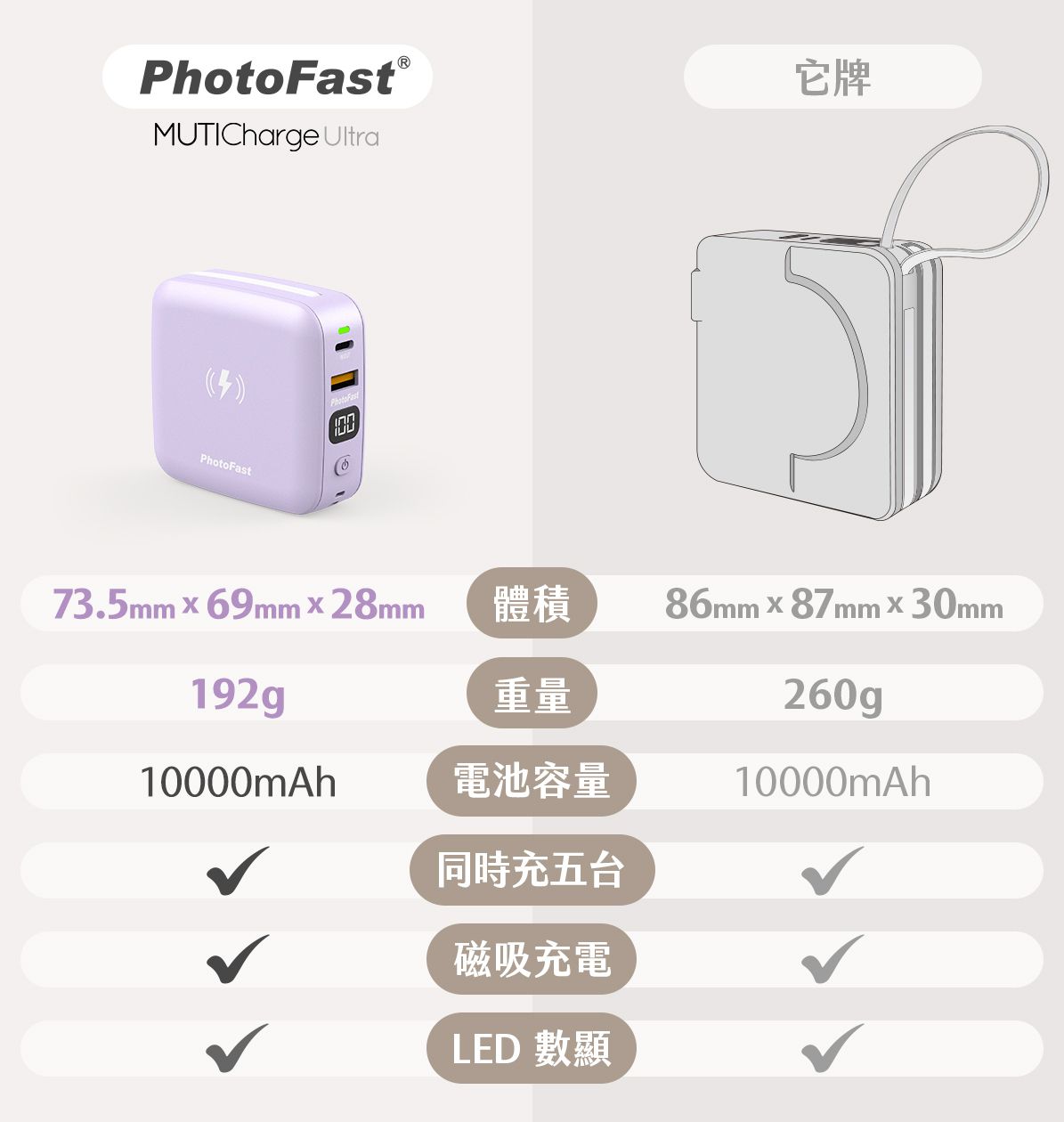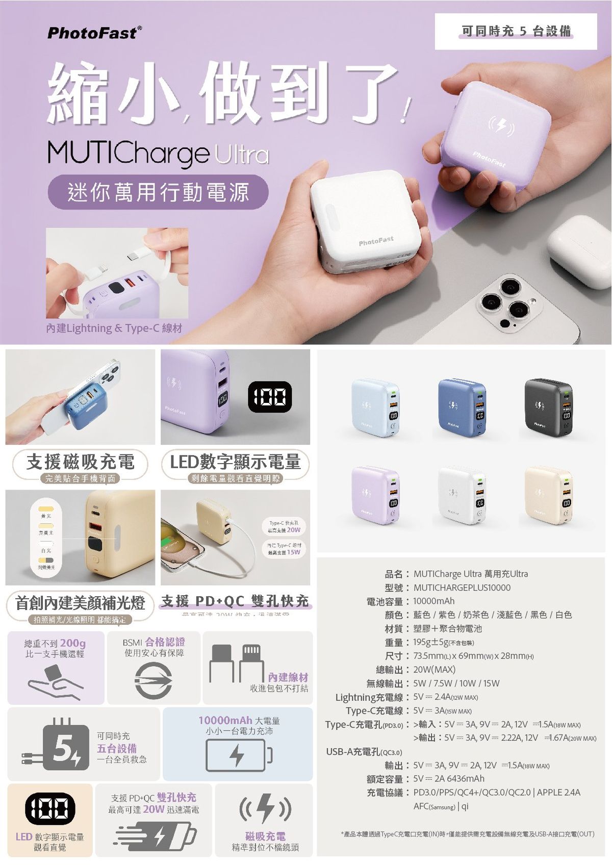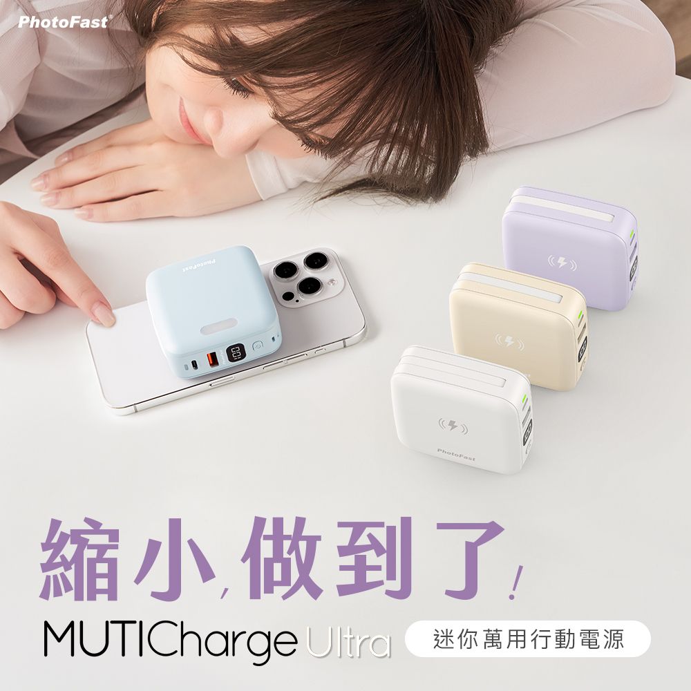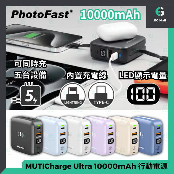 台灣PhotoFast推出最新MUTICharge Ultra 版10000mAh流動電源,產品內置2條充電線、支援MagSafe 磁吸充電及PD+ type C 雙孔快充,內置美顏補光燈,外型更靚更迷你,-機能充5 部設備,絕對係首選嘅外出必備充電神器!
