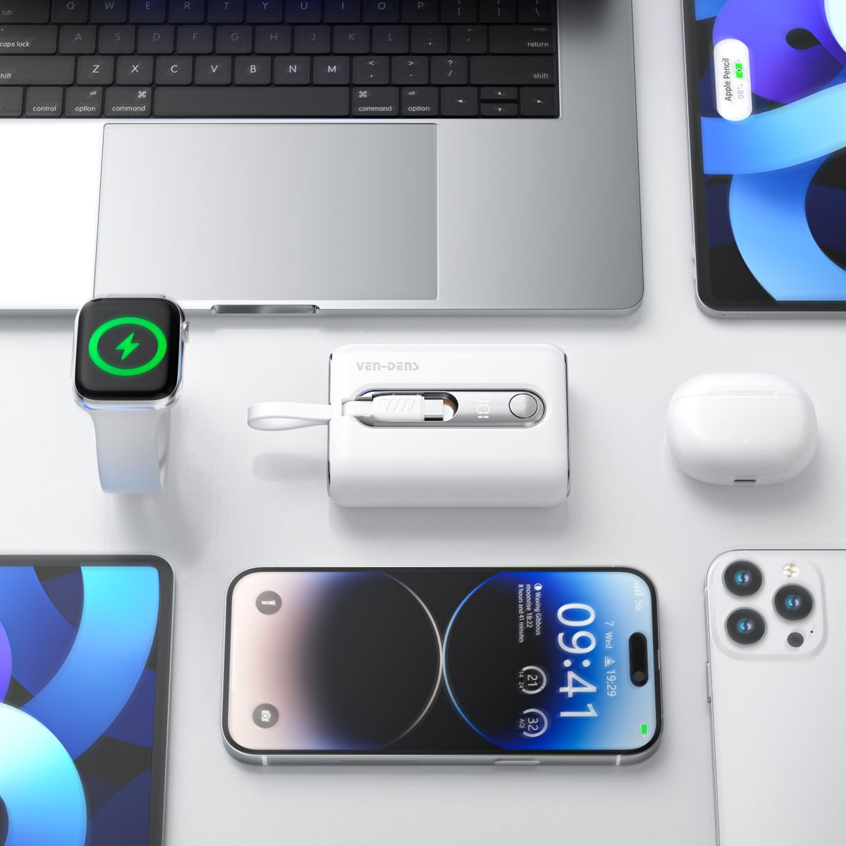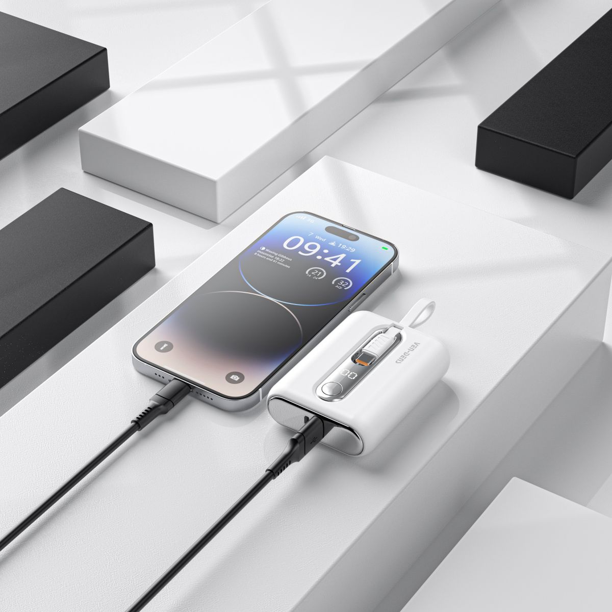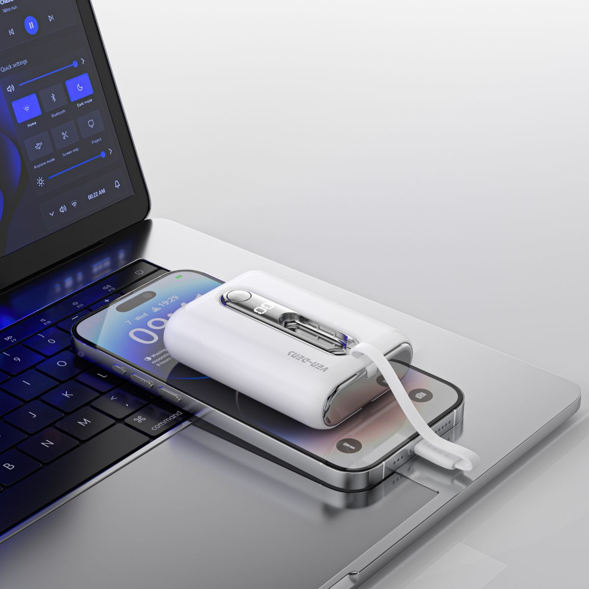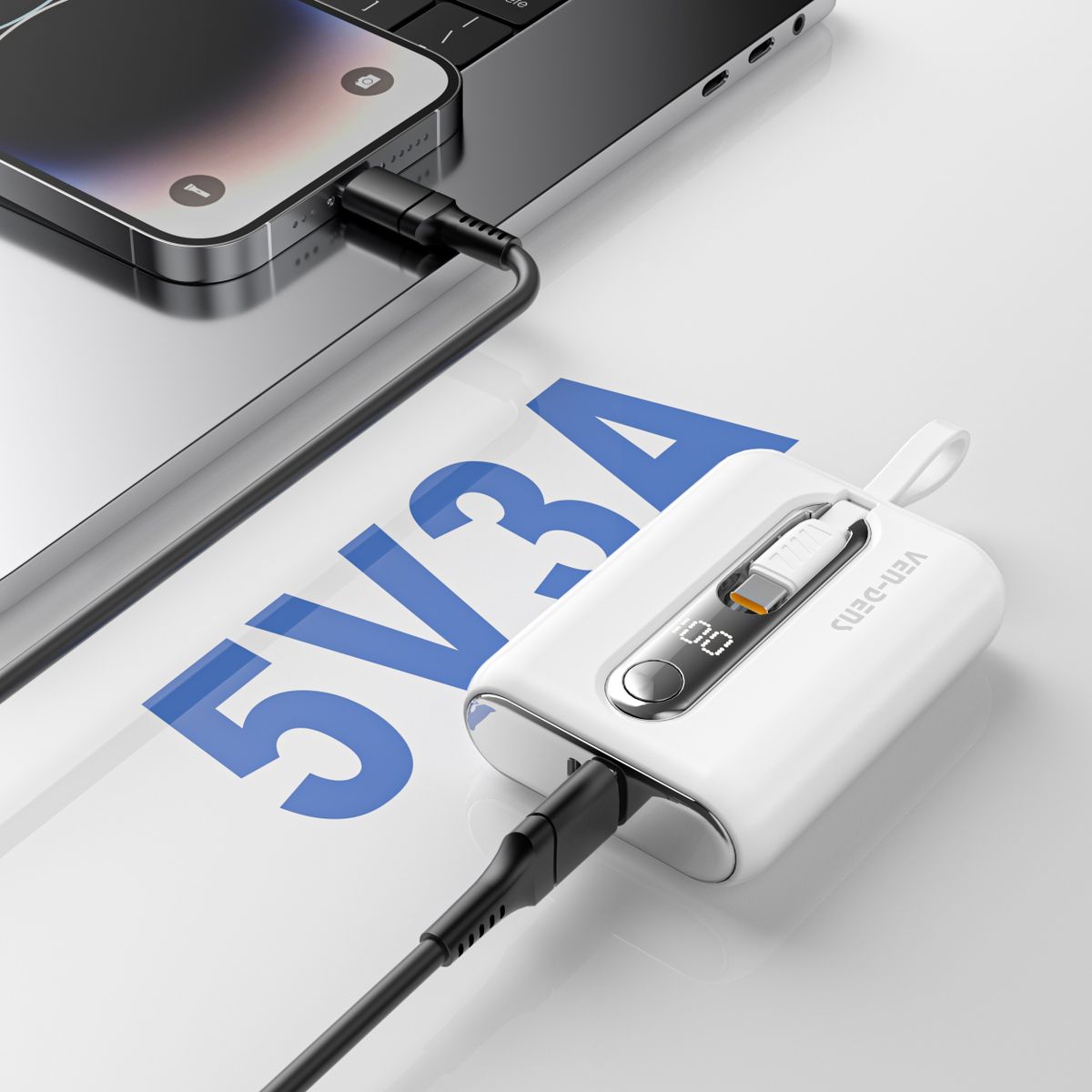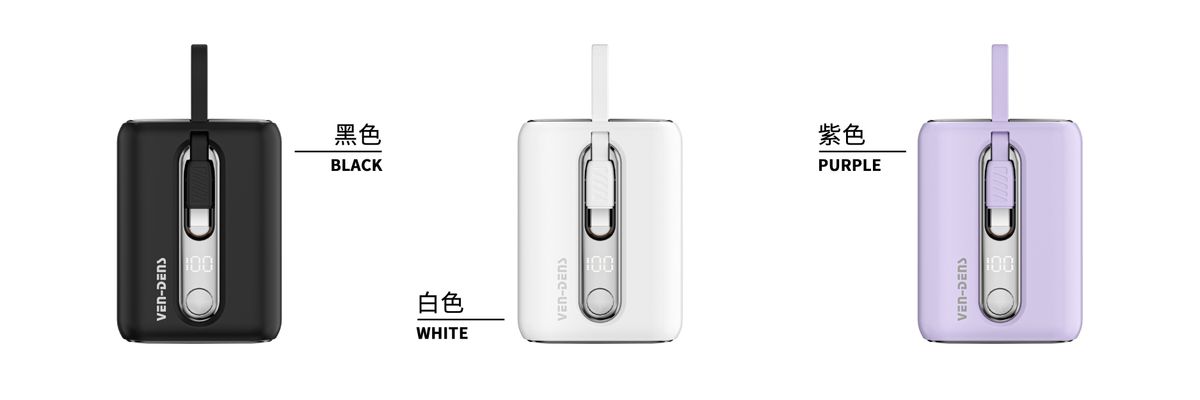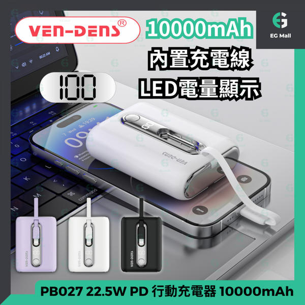 Ven-Dens PB027 黑色 22.5W PD 行動充電器 10000mAh PD & QC 流動電池 連嵌入式 Type C IOS 內置充電線 Power Bank LED 顯示屏
