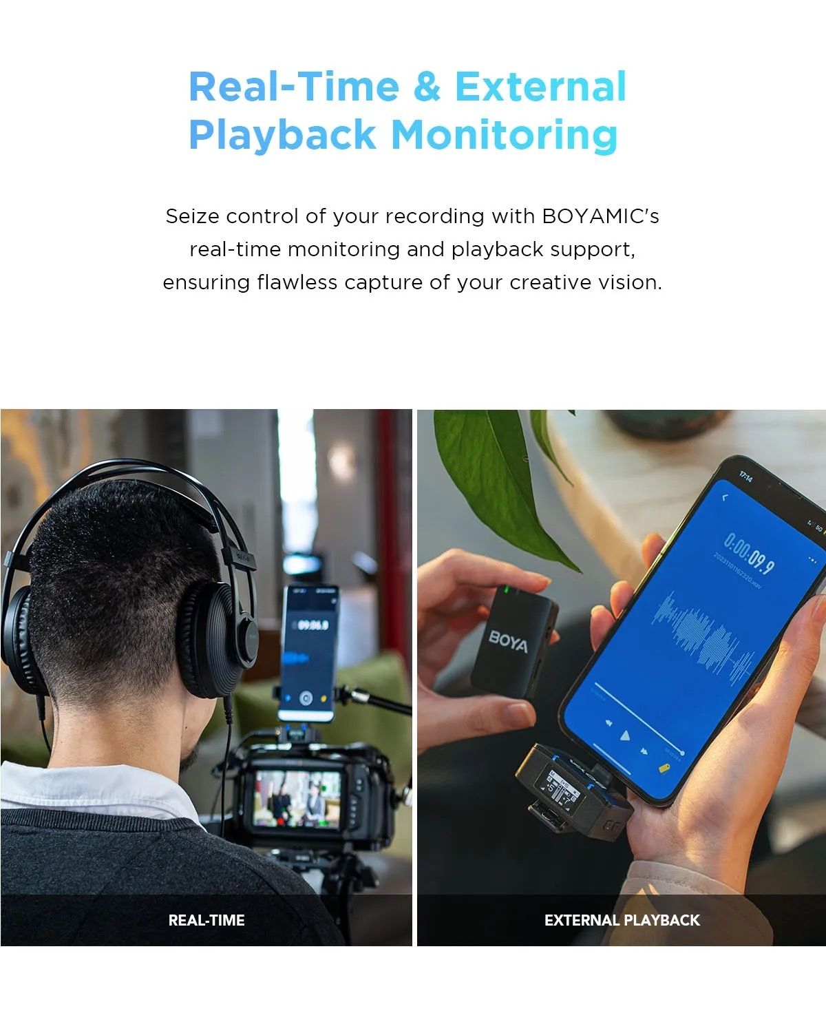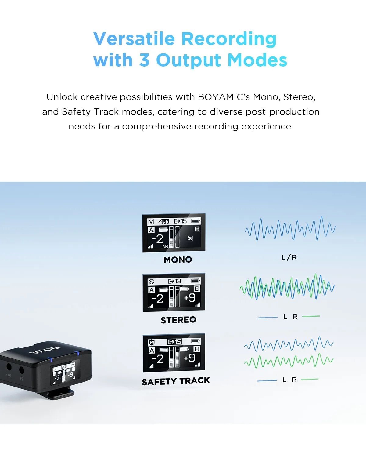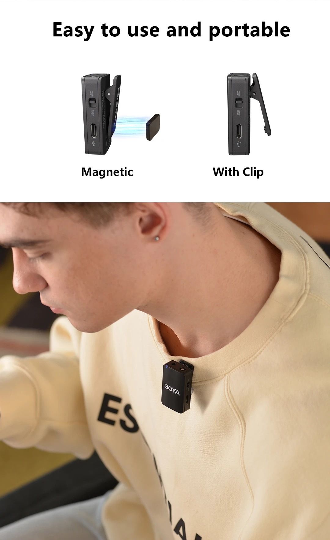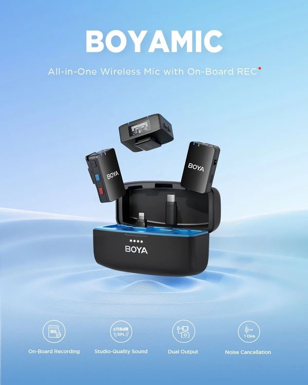 具REC 功能,支援雙機錄音,內置8GB 記憶體支援長達15 小時錄音。BOYAMIC 是全面無線降噪收音系統,包括兩個發射器、一個接收器及三種支援不同類型連接器(Android Harmony Type-C、APPLE Lightning IOS、3.5mm TRS ),全面覆蓋手機/相機/電腦等所有設備!具OLED 顯示器調整方便設置,充電盒便攜且易於長時間使用。BOYAMIC的皮帶夾兼作磁性板,為使用者提供更大的靈活性。