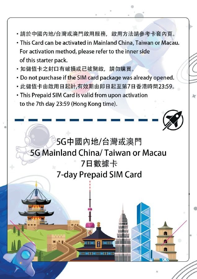 · 此卡(適用於大中華地區,包括中國內地、台灣及澳門)一經啟用,7日流動數據服務用量即時生效,而$68儲值額將隨即被扣除。