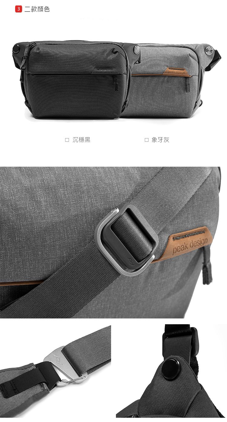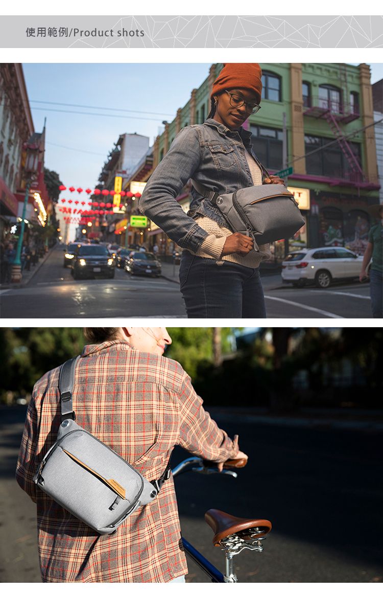 不同尺寸適用於一系列創意設置,從測距相機到專業數碼單反相機、鏡頭和筆記本電腦。 Sling 的加墊斜挎肩帶帶有一個快速調節器,您可以在取用裝備時鬆開它,在積極徒步旅行或騎自行車時收緊它