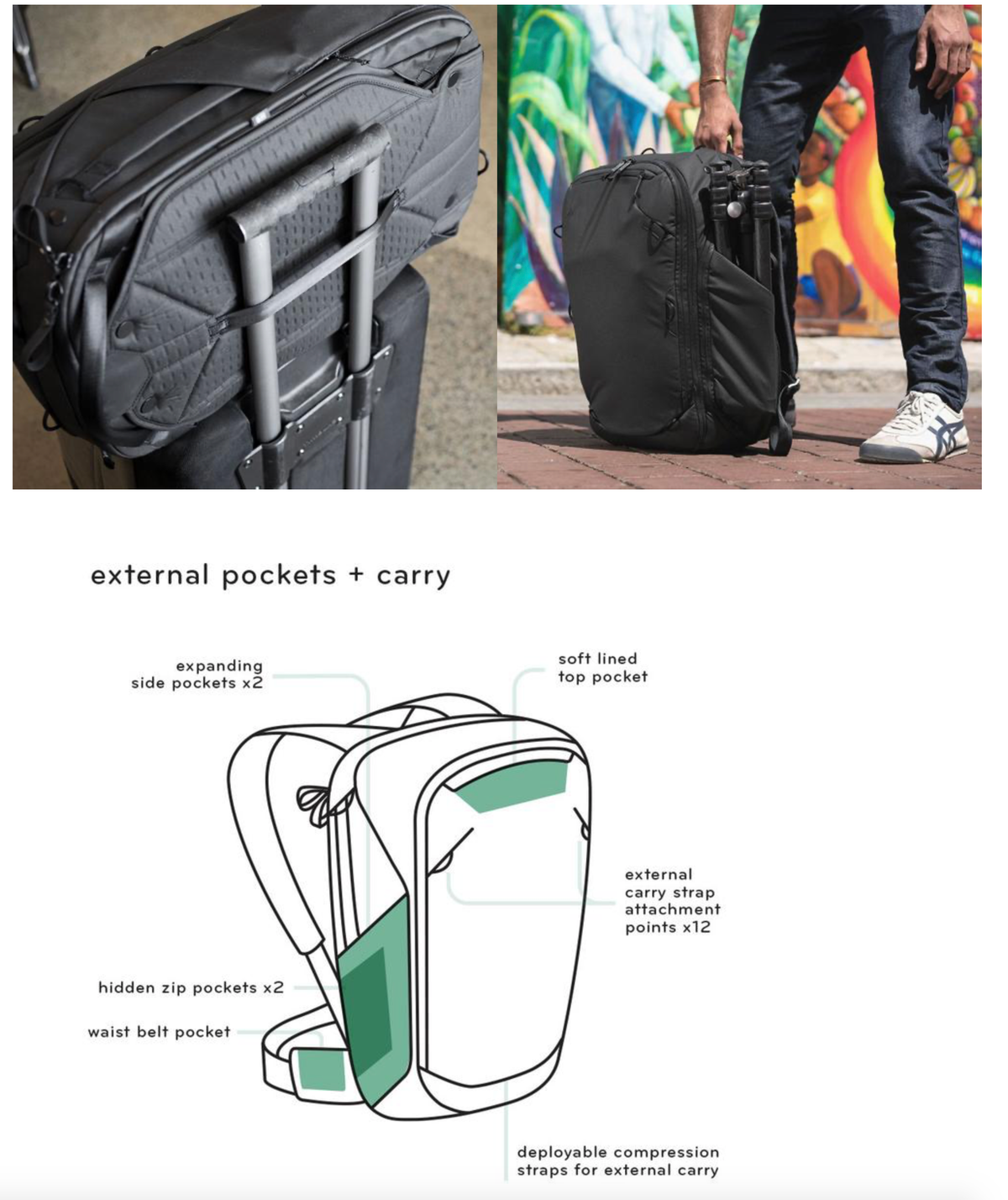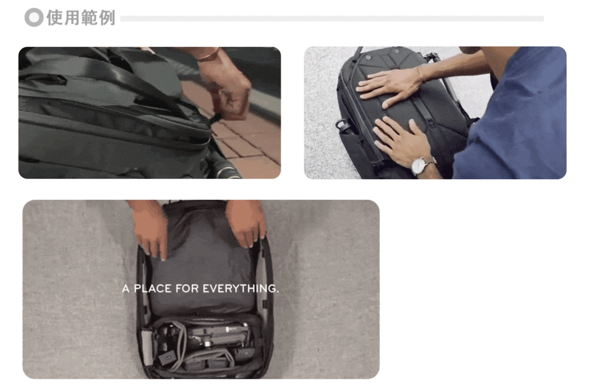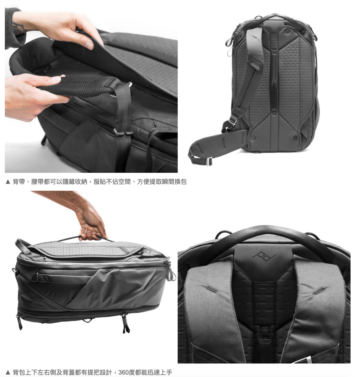 頂部 側面 前面和後面開口都配備防風雨拉鍊 可折收成35L日常背包並且符合國際航空隨身行李要求, 是一款多用途設計、著重細節、全方位實用的背包,與旅行者系列收納產品完美相容。每趟旅行可搭配各種不同收納模組,可以是相機包、行李包,陪你走遍世界各地。