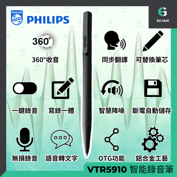 飛利浦 - VTR5910 智能錄音筆 16GB 鋁合金筆桿 專業錄音筆 高清降噪 一鍵操作錄音器 筆形錄音筆 學生上課用神器