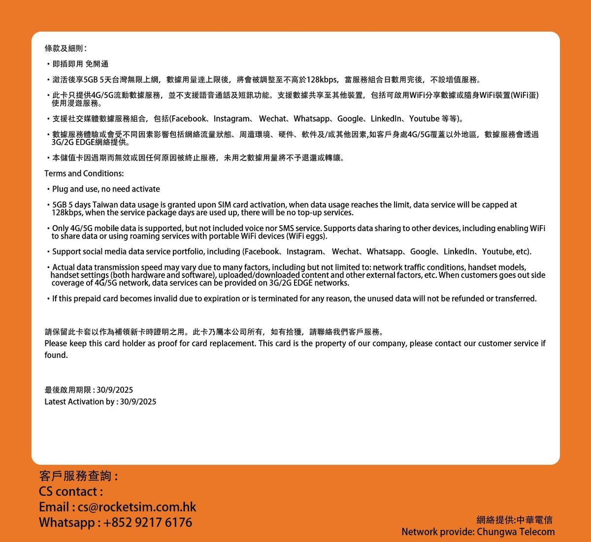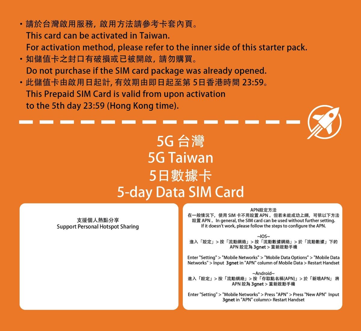 · 此卡(適用於台灣)一經啟用,5日流動數據服務用量即時生效。