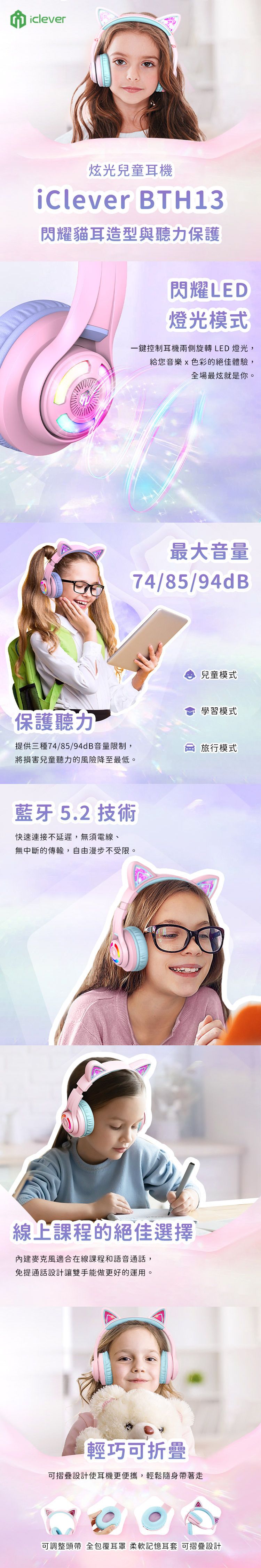 iClever - 兒童耳機 RGB BTH13 貓耳有線 無線藍牙 兒童頭戴式 無線藍牙耳機 帶咪 3.5mm 音量保護 限制 85dB 有線 無線 Zoom 網課 網上教學 Type C 充電