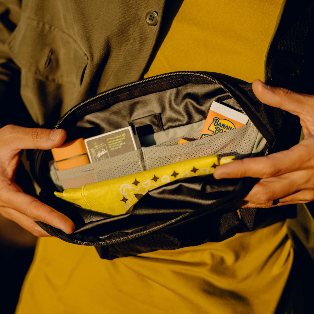 肩帶也可用於腰間攜帶。輕量 Terra Shell 210D 防撕裂 100% 再生尼龍外層採用 PU 塗層、不含 PFAS 的防水處理和堅固的防風雨 #5 UltraZip,耐磨且防風雨。