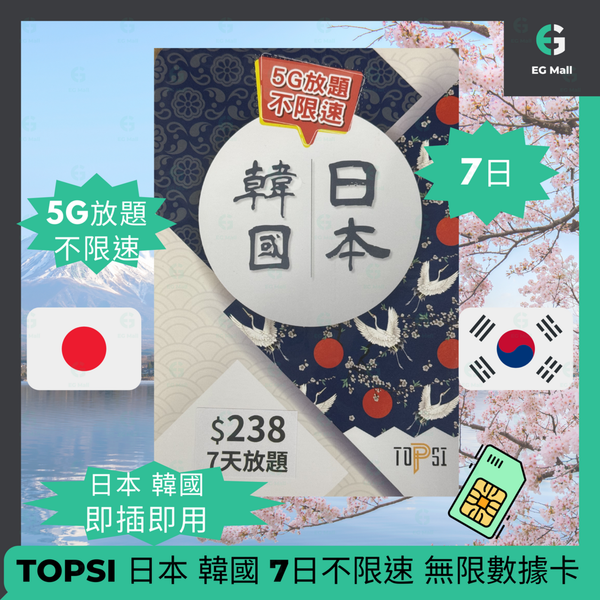 TOPSI - 5G 極速無限 日本 韓國 7日 不限速 數據放題 外遊數據卡 數據上網卡 旅行 5G LTE 無限數據卡 使用限期 30/09/2025