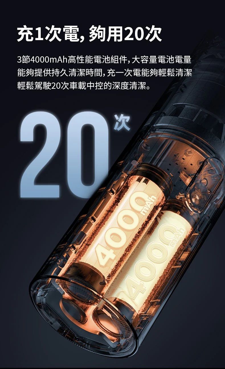 續航時間:強力模式20000pa(約20分鐘)/ 標準模式12500pa(約40分鐘) / 持久模式8000pa(約70分鐘)