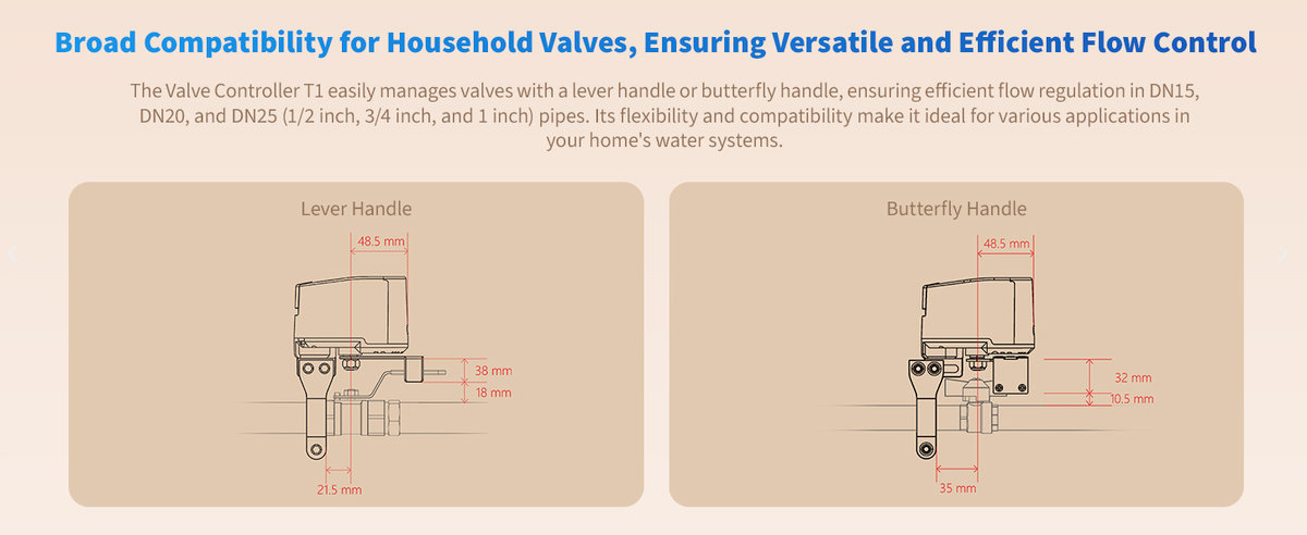 ・可安裝於水閥或燃氣閥上,適用於現有手柄式或蝴蝶閥門,兼容 DN15、DN20 和 DN25(15 mm、20 mm 和 25 mm)多種管徑,無需改動管道設計。