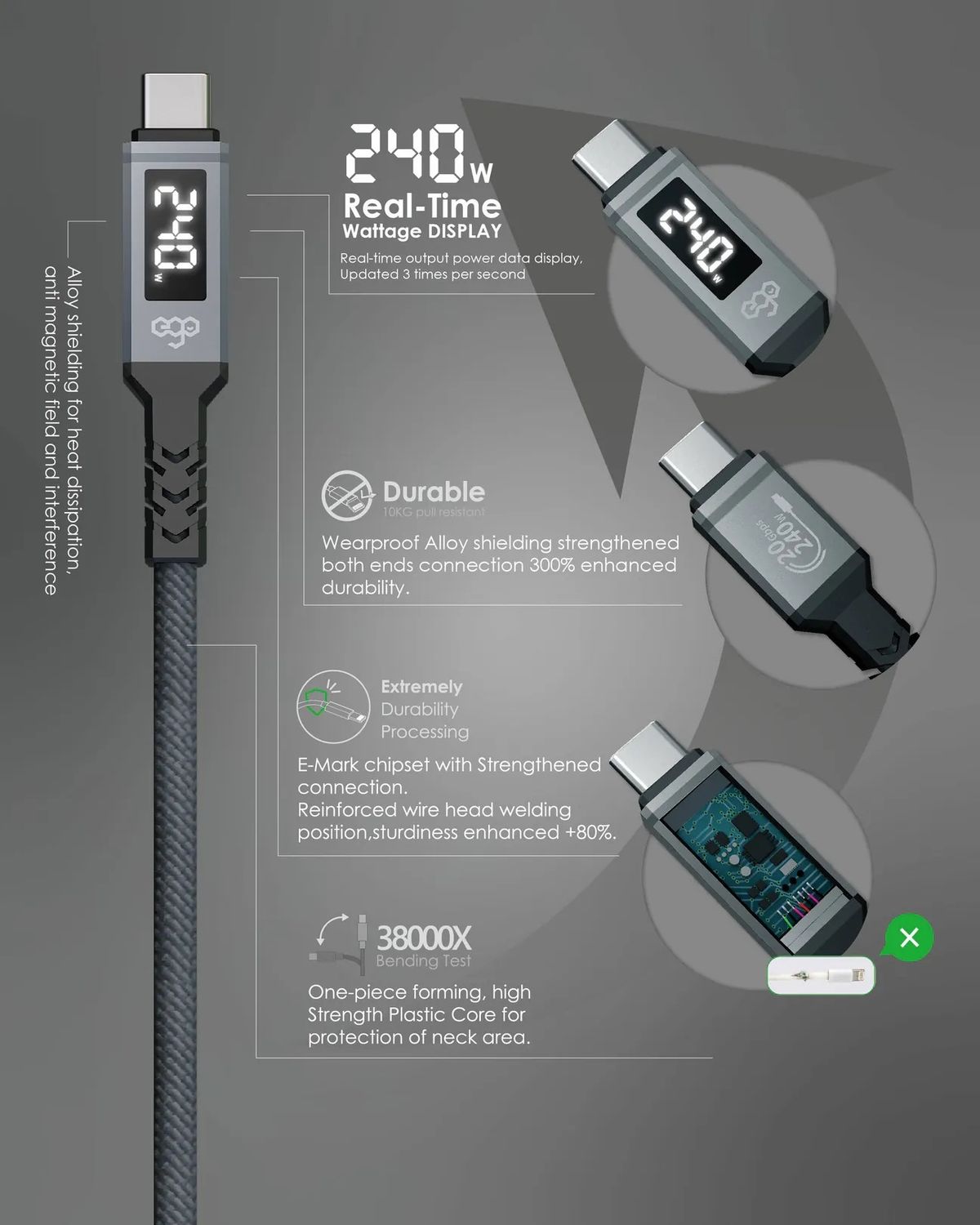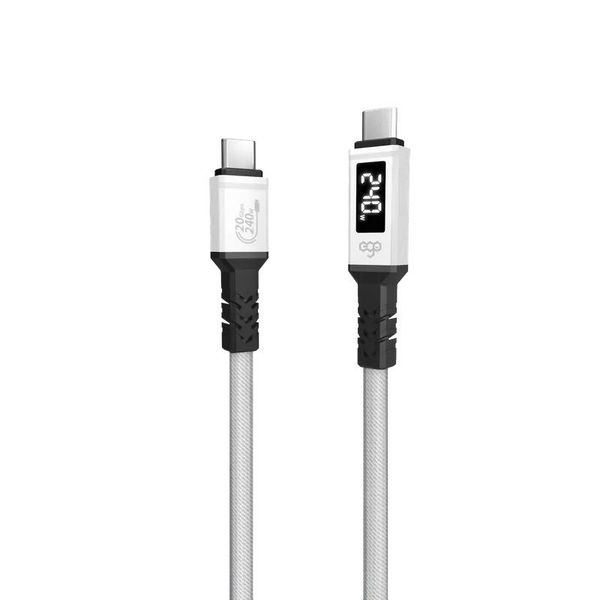 EGO WIRY MAG 240W 200cm 白色 USB3.2 Gen2X2 即時速度顯示 Type C to C 磁吸數據線 20Gbps 8K 60Hz E-MARK Chipset