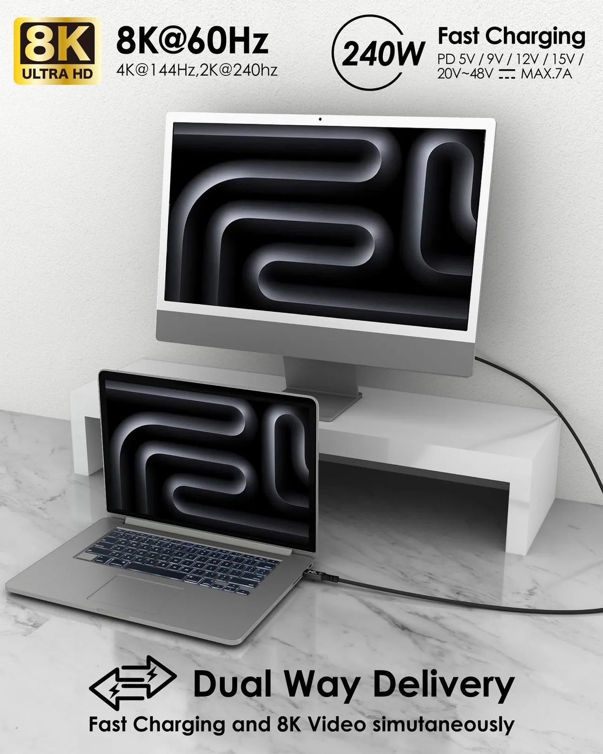 1. USB3.2 Gen2X2 規格, 20Gbps,影片8K,同時可240W充電。