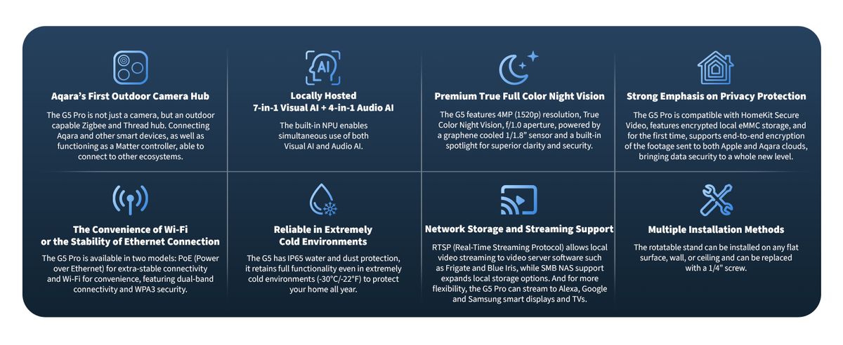 Camera Hub G5 Pro 是 Aqara 首款 專為戶外使用而開發的監視器。4MP G5 Pro 提供 PoE 和 Wi-Fi 版本,配備真彩夜視和設備內建AI 功能,可偵測和識別人臉、車輛、寵物和包裹。