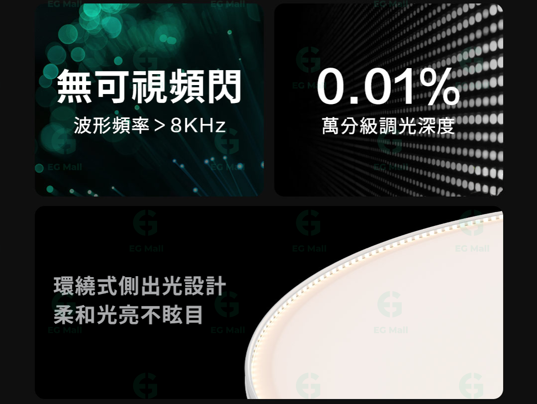 雙色溫護眼採用側光技術,經多層光學結構導出光線,柔和不刺眼,並配有與主燈同步滲光效果,營造舒適的環境