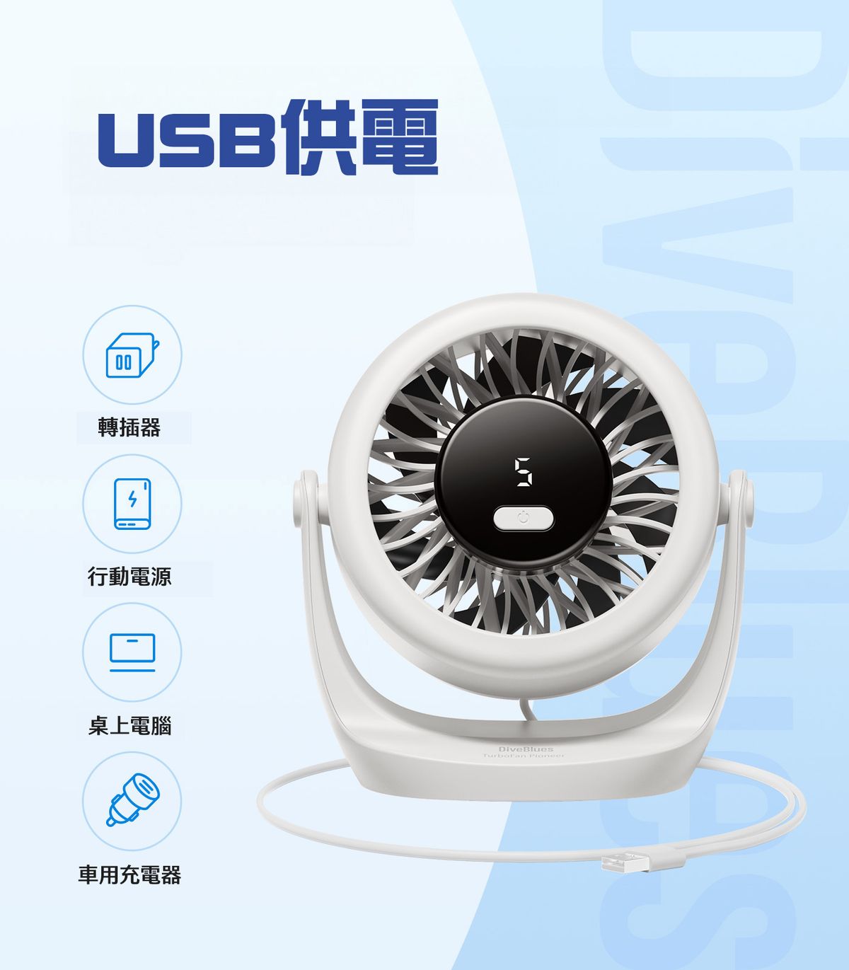 Diveblues - Turbo Breeze 坐枱USB風扇 桌上高速渦輪風扇 4500RPM USB供電 上下旋轉 360 靜音設計 30db