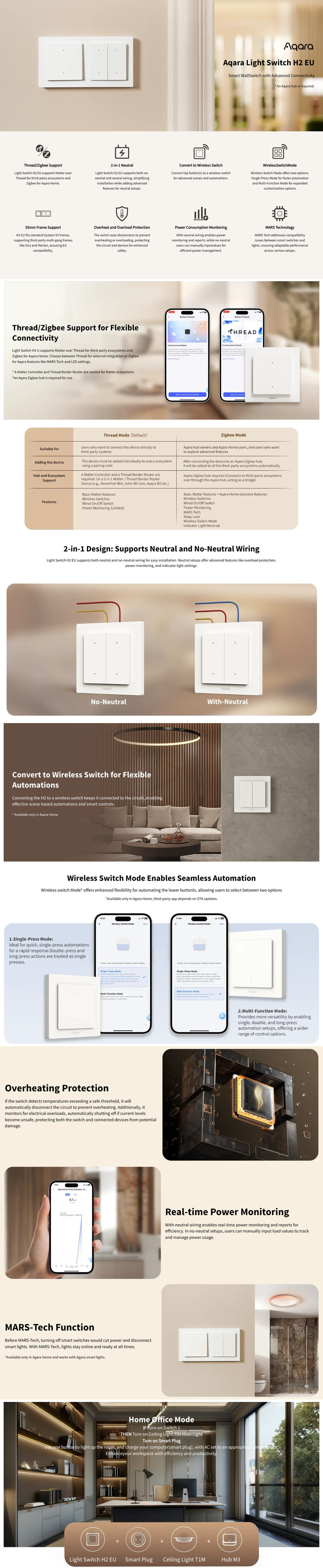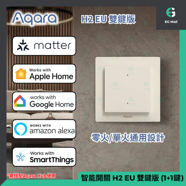 Aqara - 智能開關 H2 EU 雙鍵版 白色(1+1鍵) + 灰色 面板替換 套裝 牆壁開關 智能家居 零火 單火 通用 支援 1個實體燈掣 + 1個無線開關
