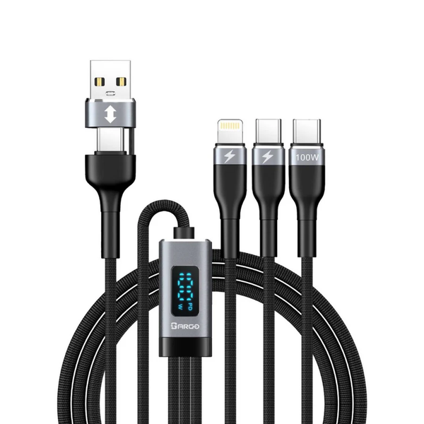 全方位高效充電,資料傳輸無縫連接:ARGO-LC23 3 IN 2 充電線提供雙Type-C頭 - Android + Apple Ios Lightning 頭設計,支持USB-C裝置PD3.0 100W快充 - 手提電腦叉電線,並配備LED顯示屏,實時顯示充電瓦數,讓您隨時掌握充電狀態。
