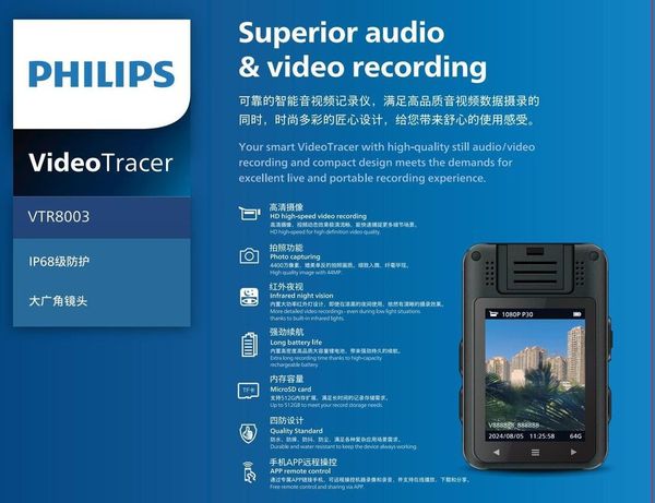 飛利浦 - VTR8003 2K 高清隨身攝錄機 4400萬像素 執法記錄器 IP68 運動Cam 防水 防摔 Vlog 行車記錄儀 車Cam 高清夜視 胸前佩戴 錄影 錄音Android 視訊記錄儀