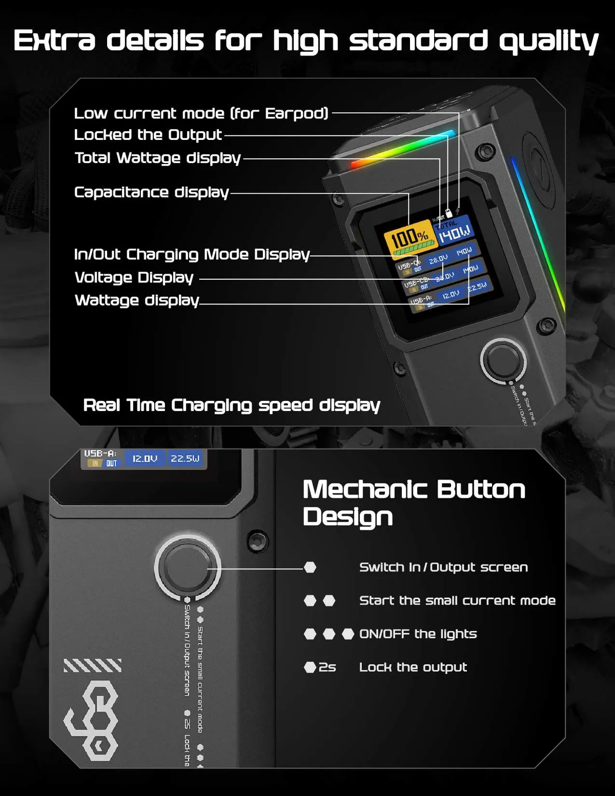 1. 輸出100~80%電量 140W, 80~10%電量 輸出100W, 比上一代整體輸出功率大增200%時間