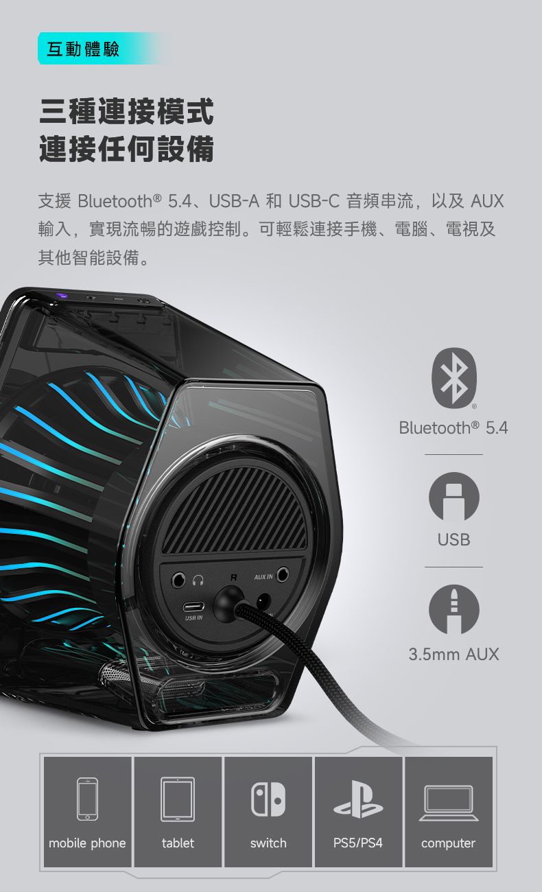 「四種模式的連接方式」- 支援 Bluetooth V5.4、USB-C、USB-A 和 3.5mm AUX 輸入模式,以滿足多種需求。