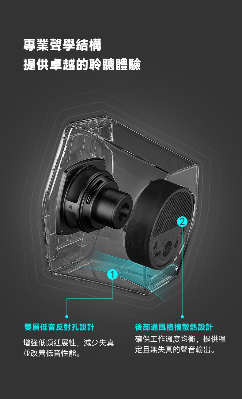「倒相管增強聲波和低音效果」- 底部倒相管設計讓低音表現更醇厚有力。