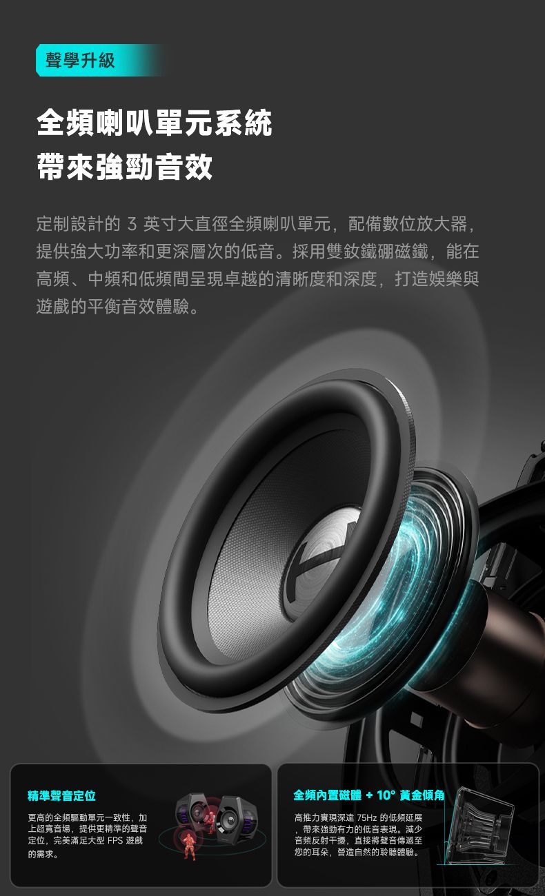 「3 英寸單元提供卓越音質」- 3 英寸全頻內置磁體喇叭具備 64W 峰值功率,音效表現出色。